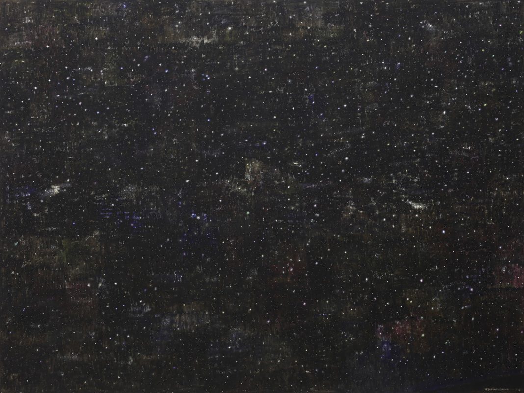 E la forza di attraversamento di questa pittura, il suo affiorare da lontano, può intendersi anche in senso trans storico, mettendo a contatto il contemporaneo con il passato, ma per fare di entrambi qualcosa di diverso. C’è, infatti, una potente inattualità in questi cieli stellati, persino la presenza di un sentimento romantico, l’umana emozione dell’essere nulla di fronte all’infinito visibile, ma subito incrinata dalla presenza dell’opera in quanto tale, il suo essere oggetto, pezzo davvero di pittura che si mostra senza finzioni, pittura quasi monocroma, monocromo già troppo discontinuo per non essere profonda pittura di nera luce.
