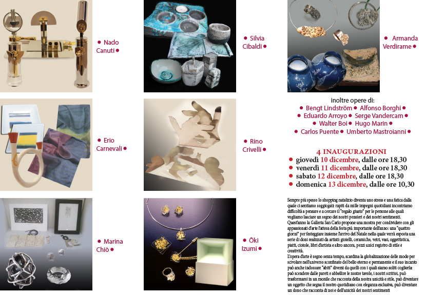 Quest’anno la Galleria San Carlo propone una mostra per condividere con gli appassionati d’arte l’attesa della festa più importante dell’anno: una “quattro giorni” per festeggiare insieme l’arrivo del Natale nella quale verrà esposta una serie di doni realizzati da artisti: gioielli, ceramiche, vetri, vasi, oggettistica, piatti, ciotole, libri d’artista e altro ancora, pezzi unici registro di stile e creatività.
