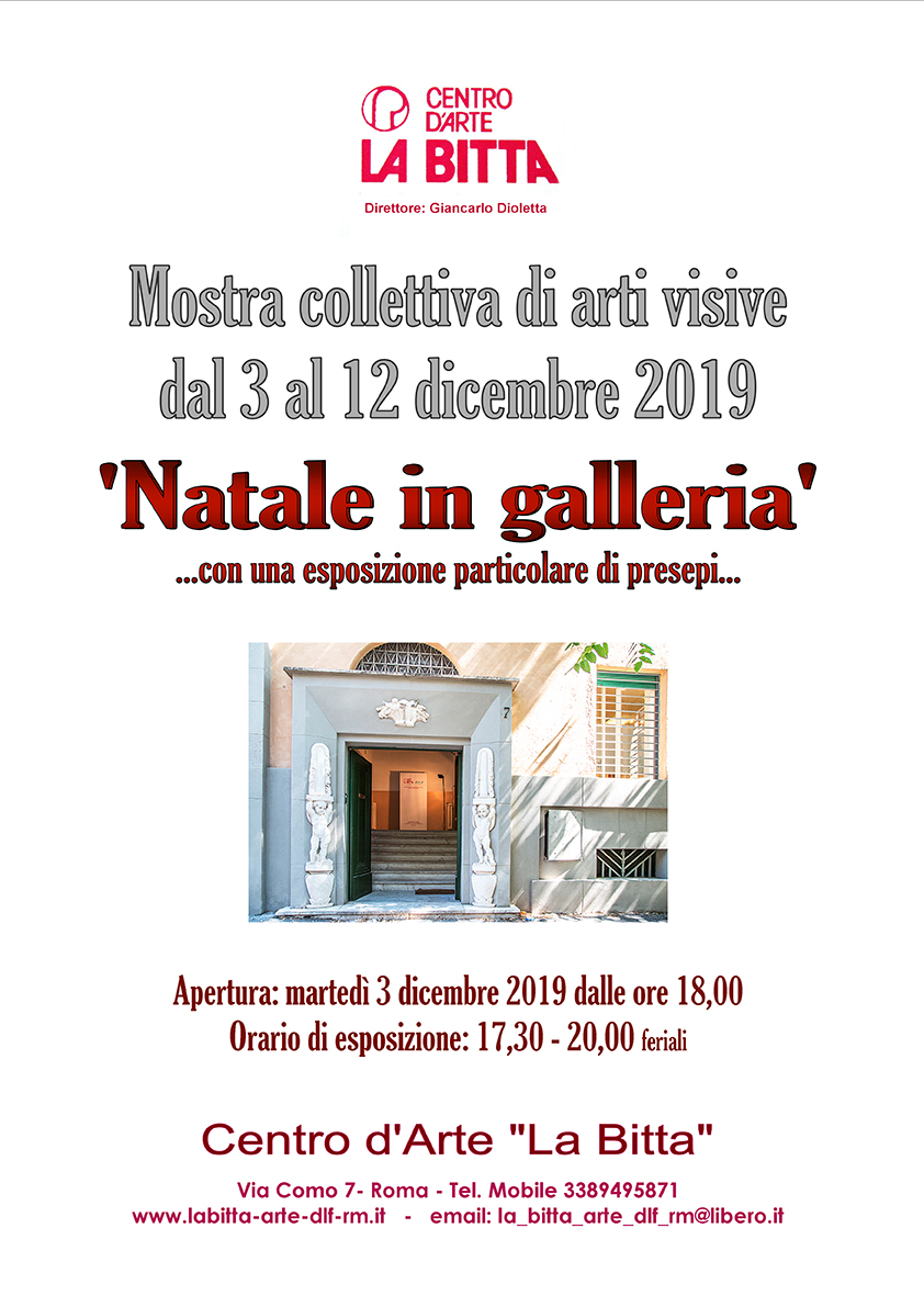 Con la mostra collettiva di arti visive " Natale in galleria " si conclude l'anno 2019 nel quale il centro d'arte La Bitta ha manifestato con i propri eventi tante espressioni di natura artistica e si propone con entusiasmo per prossimi appuntamenti che lo attendono. La mostra è a tema libero pertanto, in quest'occasione, si darà ampia scelta all'artista che vorrà esporre le proprie opere pittoriche, scultoree e fotografiche. Inoltre quest’anno verranno esposti anche dei particolari presepi per la gioia dei bambini e non solo!