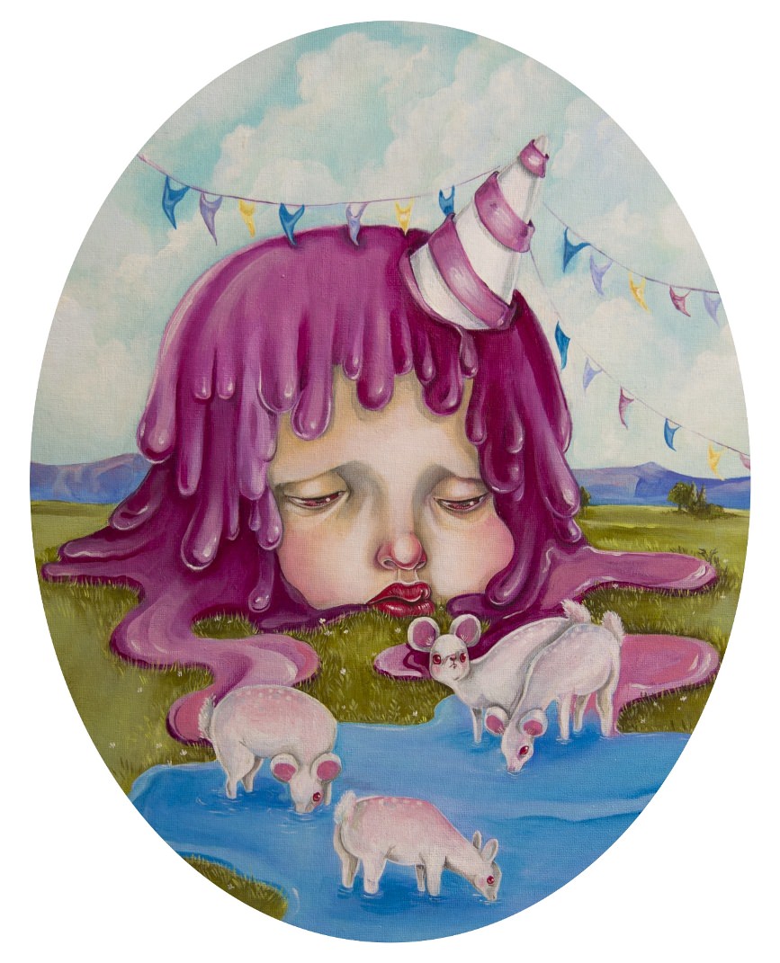 Vari i motivi dell’invenzione di Natascia Raffio che hanno incontrato il lavoro teorico della Galleria Core per l’affermazione e la sperimentazione della cuteness italiana. Quindici pitture a olio realizzate per questa mostra presentano il suo personaggio avatar, Gogolì. Esso condivide alcune forme riconoscibili del più celebre personaggio Disney elevandole a segni della propria identità non affrancata, affidata dall’autrice ai personaggi del mercato che hanno popolato la sua e la nostra infanzia. L’insieme è una narrazione di apparizioni ambientate tra paesaggi montani, a volte bucolici, appartenenti alla geografia delle sue memorie infantili – le Dolomiti – quasi totalmente sovrapposta a certe ambientazioni convenzionali della finzione commerciale, così come l’autrice si autoritrae nel suo disneyano personaggio. Il sogno o incubo prende vita in questo modo, come una natura-merce benjaminiana nella quale le cose sono feticci e con esse le forme umane, come mostrano un corno e una testa disciolte in un magma che sembra gelato, e poi quelle stesse teste affogare nella loro oggettualità. E qui l’accostamento surrealistico – e il perturbante – o il riferimento mitologico di alcune figure è depotenziato dal loro valore di consumo e da certo orchestrato alleggerimento pop della simbologia. Tutto ciò, nella pittura della Raffio, è espresso da morfologie neonatali in alcuni soggetti che hanno l’effetto di una deformazione “graziosa”. Gogolì stesso ritratto peraltro come una testa animata di vita propria, che a volte con bella invenzione staglia la sua morfologia “commerciale” nel paesaggio come una roccia: merce, scultura e natura. E dunque attraverso una specifica modellazione neonatale degli arti di alcuni personaggi o della natura che è ampiamente posseduta dalla pittrice quanto forma oggettiva della dialettica tra violenza e tenerezza dell’estetica cute. Ciò che le permette di collegare le gambe di una figura in carrozzina con lo stesso oggetto fino a una sola forma mutilata equivalente alla piccolissima ruota della carrozzina che si anima teneramente. O di mescolare la graziosità quasi morbosa dell’ornamento floreale alla tenerezza del soggetto reificato come un gadget. È vero però che, l’esplicito, o quantomeno riconosciuto appartenere di questo mondo a un immaginario personale, che tra l’altro collega tutti i quadri a un lago come motivo ricorrente e ossessivo, conferisce forse all’insieme quasi il senso della familiarità del ricordo.