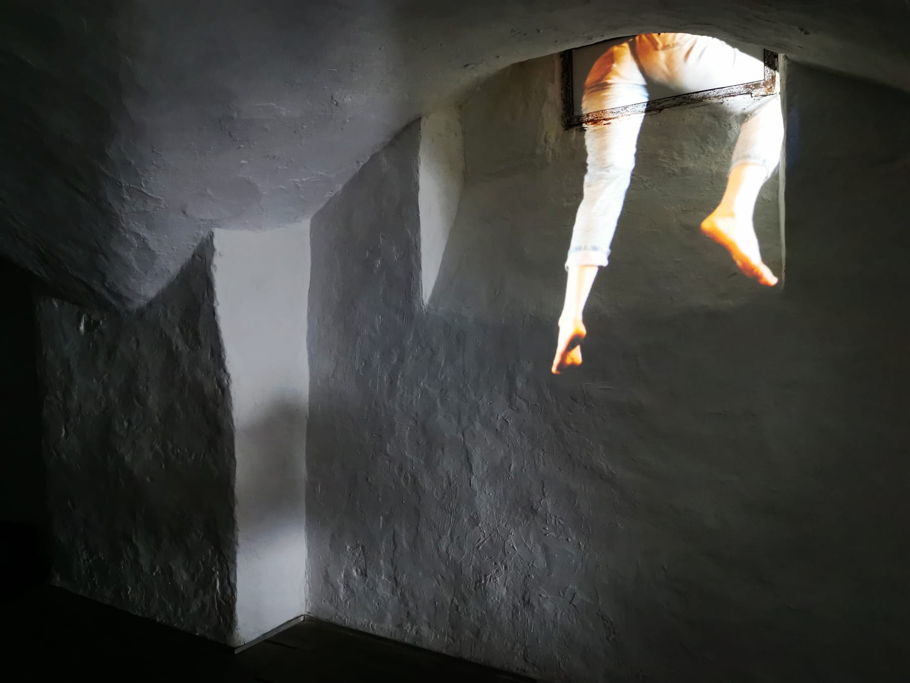L’installazione di Nathalie Maufroy, artista belga residente al Chiasso Perduto, abita una soglia instabile, un confine deliberatamente sfuocato tra cose o persone che spesso diventano invisibili perché preferiamo ignorarle o perché sono ordinarie, e ciò che accade in una dimensione più intima, domestica e silenziosa. Da un lato emergono frammenti di immagini e voci che raccontano, ad esempio, la solitudine degli anziani, l’attesa di una compagnia assente come un controcanto, le voci dei bambini irrompono con un gioco spensierato che si mescola a un elenco di divieti, eco dell’ambiguità di ogni situazione. Il percorso si popola poi di personaggi che compiono azioni in loop, attraverso mani, braccia, corpi frammentati che ci restituiscono possibili versioni di situazioni anche opposte, che convivono nello stesso contesto.