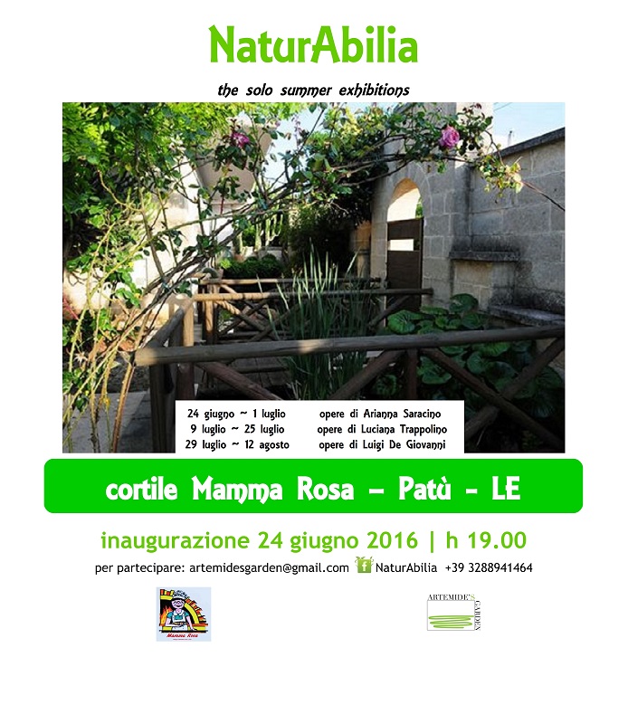 Artemide's Garden in collaborazione con L'Associazione Don Liborio Romano presenta: "Naturabilia", una rassegna di mostre d'arte personali che si alterneranno ogni due settimane per tutta l'estate. I primi appuntamenti: