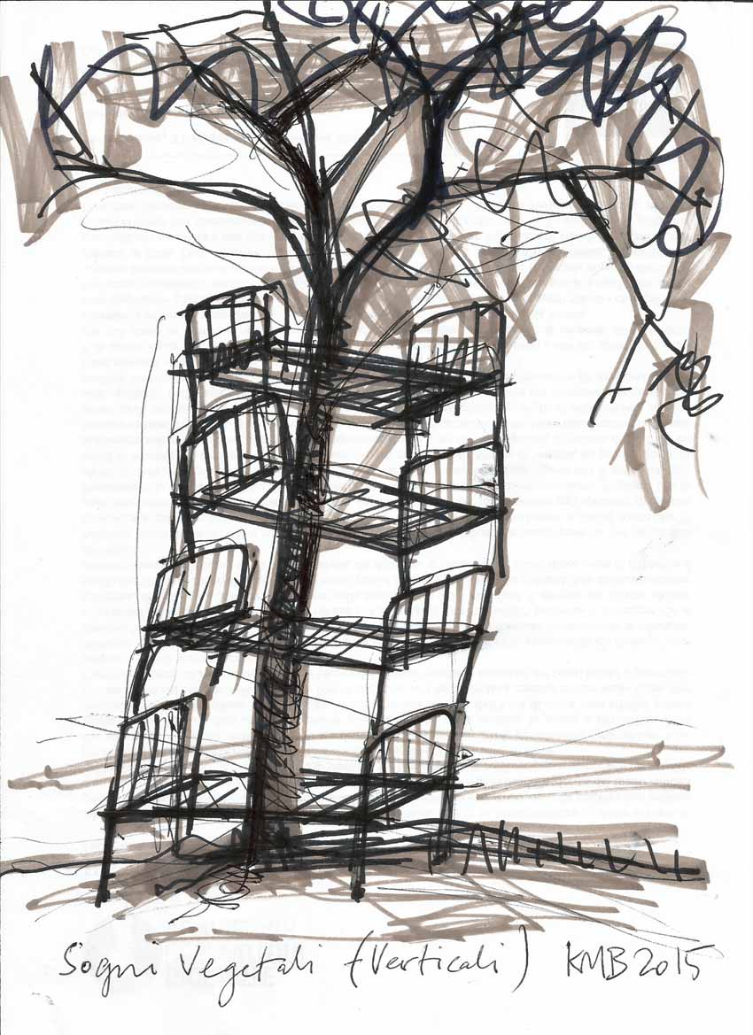 Con un effetto drammatico e straniante Krzysztof M.Bednarski contrappone al materiale vivente dell’albero, il residuo metallico di quella che è una delle esperienze più naturali e comuni, il sonno. Il confronto tra naturale e artificiale diventa spettacolare nell’installazione Sogni vegetali (verticali) che ingabbia un albero – tronco, rami, fronde e foglie – all’interno di un’impalcatura verticale di vecchi letti d’ospedale riprendendo e rielaborando la simbologia dell’installazione Vegetal Dream realizzata già nel 2010 per One Minute Tree.
