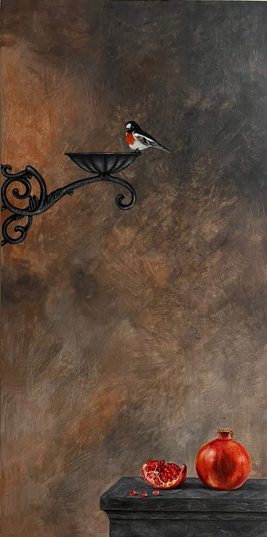 L’impulso che l’artista muove verso la creazione delle sue opere deriva dall’empatia che instaura con il suo sguardo introspettivo. E come se ascoltasse la sua voce interna, i suoi sentimenti e trasporta sulla tavola con pennellate ad acrilico ricercate e minuziose le sue straordinarie nature morte.
