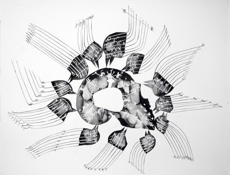 D'altra parte l'intero lavoro dell'artista iraniano si fonda sulla connessione di elementi e di simboli che scaturiscono dalla confluenza di culture e tradizioni mediorentali. Quello che lui mette in atto è un probabile paradigma di flussi culturali, di migrazioni umane e, in definitiva, della circolazione costante del pensiero nei luoghi e nei tempi delle grandi civiltà antiche in terre di confine tra Asia ed Europa. Si tratta quindi di confluenze raccontate e messe in scena attraverso un linguaggio semplice, ma allo stesso tempo criptico, un linguaggio contemporaneo proprio della sua generazione legata sì alla sapienza del disegno e della pittura, ma naturalmente predisposta al mezzo espressivo del grafito e delle tags. Teschi, mele, cipressi, scritture persiane con valore di talismano, insieme costituiscono gli elementi in movimento del suo linguaggio simbolico, un vortice che si moltiplica e si raddoppia, una danza sacra scandita attraverso inchiostri neri dalle mille sfumature e dalle infinite suggestioni."
