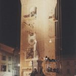 Luogo eletto ad ospitare l’esposizione, la Torre civica di Recanati, immota testimone e protagonista assoluta tra le centinaia di spettatori che allora invasero la piazza; specchio prossemico, prossimo al Carmelo Bene della Divina Commedia, che nel 1981 diffondeva Dante a Bologna, dall’alto della Torre degli Asinelli.