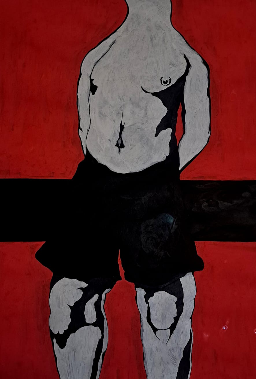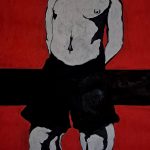 Davide Piazza per mezzo di un linguaggio sintetico costruito su un contrasto netto tra campiture piatte e segni incisivi, mostra il corpo umano ridotto ad anonima silhouette, frammentato e deformato: figure senza volto in cui si perde ogni rassicurante riconoscibilità per lasciare posto a presenze ambigue e vulnerabili, cariche di tensione emotiva.