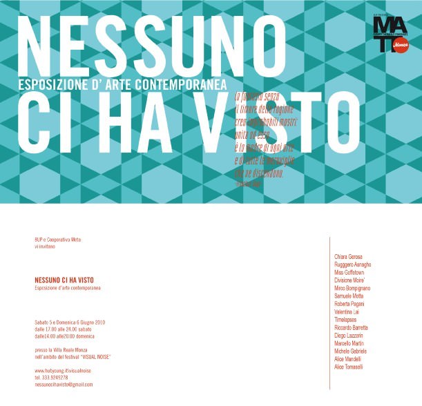 8UP, collettivo curatoriale nato nell’ambito del progetto Hub Young con la produzione delle Mostra-Evento itineranti MATT, promuove “Nessuno ci ha visto”, collettiva d’arte contemporanea emergente, in occasione del festival Visual Noise, presso la Villa Reale di Monza il 5 e 6 giugno 2010.