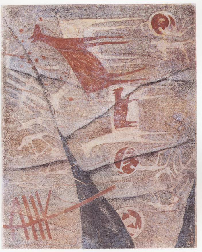 La mostra attuale è giocata sul confronto tra la rivisitazione delle prime manifestazioni artistiche dell’uomo del paleolitico e le forme espressive della contemporaneità. Campeggiano sulle tele graffiti preistorici, incisioni rupestri resi con sensibilità ed inquietudini che si rivelano altamente attuali.