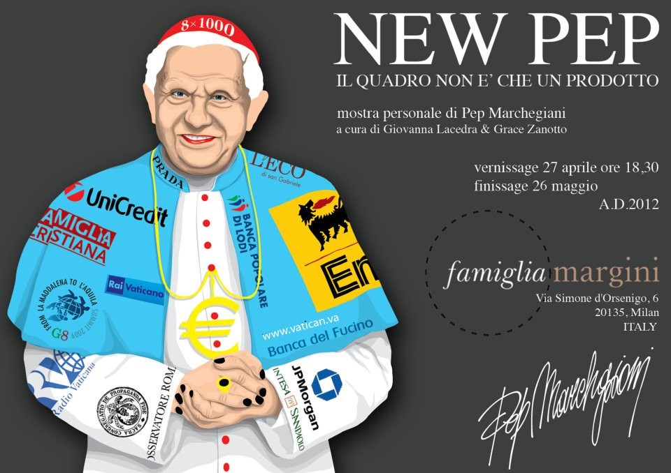Oggi, a distanza di più di mezzo secolo, un artista come Pep Marchegiani decide di ribaltare i principi di base della Pop Art, nonché le regole di mercato. Capisce che, per essere comunicativamente incisiva, l’immagine riconoscibile – il marchio, il logo, il ritratto o la caricatura del personaggio noto - deve essere riprodotta su supporti accessibili al grande pubblico, ovvero a quella fetta piuttosto farcita di gente che nelle gallerie e nei musei non entra quasi mai.