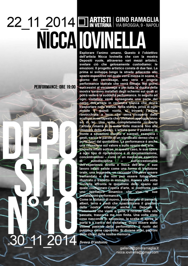 Esplorare l’animo umano. Questo è l’obiettivo dell’artista Nicca Iovinella che con la mostra Depositi vuole, attraverso vari mezzi artistici, svelare ciò che gelosamente custodiamo: le emozioni. Il progetto artistico consta di due fasi. La prima si sviluppa lungo la strada adiacente allo spazio espositivo nel quale verrà messa in scena, il giorno del vernissage, una vera e propria performance teatrale che verrà filmata. Nei giorni successivi al vernissage e per tutta la durata della mostra saranno installati degli schermi sui quali si potrà vedere la suddetta performance. In seguito ad ogni visitatore verrà consegnata una parte del corpo dell’artista in ceramica bianca che dovrà trasportare nella stanza. Nella stanza, priva di ogni mobile e quindi vuota, si troverà l’artista rannicchiata a terra che verrà ricoperta dalle sculture in cartapesta che i visitatori appoggeranno su di lei. Una volta completamente ricoperta l’artista rimarrà al di sotto delle macerie fino alla chiusura dello spazio. L’artista pone il pubblico di fronte a situazioni insolite e surreali, esaspera i gesti, carica le parole di un significato denso che ci porta fuori dal quotidiano. La performance è anche una riflessione sul valore e sullo spazio dell’arte.