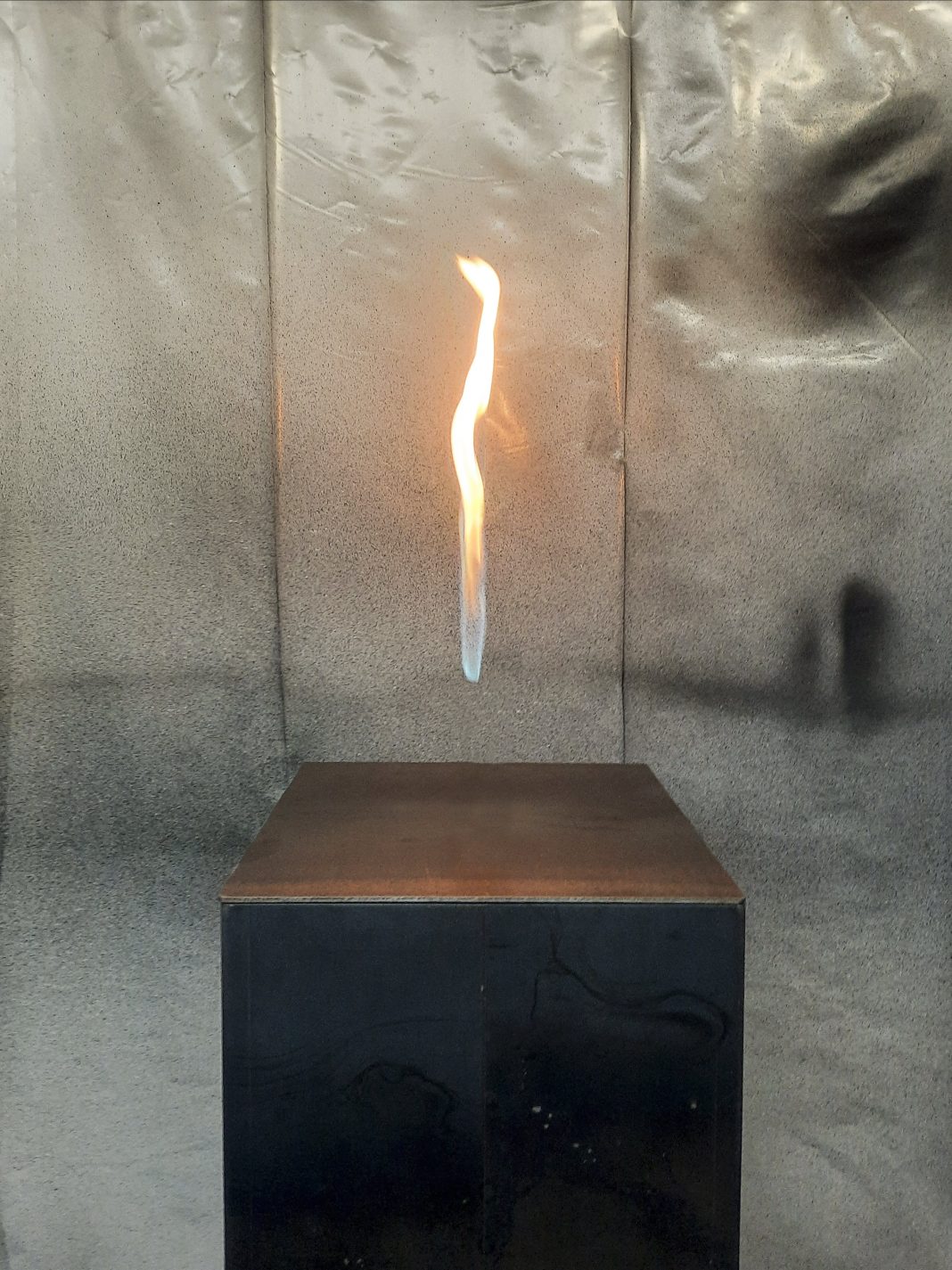 Si tratta di un accendino in ottone bronzato, una copia da un oggetto comune in plastica realizzato con materiale durevole, nobile, riuscendo a mantenerne attiva la funzione pratica originare, generare una fiamma. Fuel my fire così riporta su un piano materiale l’astrazione concettuale operata con la serie in mostra Flight Formation aggiungendo una pedina nel magico gioco della percezione.