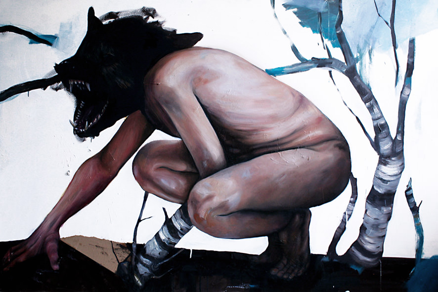 Uomini-cane e bambini sfigurati, scimmie con tre occhi, una donna-pesce in agonia: famelici ibridi nati dalla mescolanza o dalla lotta tra uomini e animali, sono i protagonisti della recente ricerca pittorica di Nicola Alessandrini