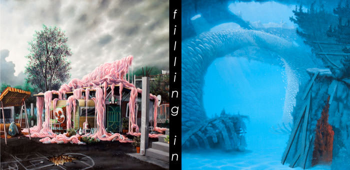 La serie di opere che gli artisti presentano sono connotate da un’intensa vena lirica ed evocativa e riflettono sul “topos” del rapporto uomo-natura nell'epoca contemporanea. Un cammino, il loro, che si tende tra affinità e opposizioni tematiche, prospettive difformi e approcci coincidenti. La peculiarità comune è la critica radicale alla razionalità cosciente e l'emancipazione delle virtualità immaginative dell'inconscio, per il raggiungimento di uno stato conoscitivo “oltre” la realtà. Le immagini che costituiscono le opere sono il risultato di un ripristino di dati, imput, forme, conservate all'interno della memoria visiva e che generalmente non vengono percepite dall'occhio poiché situate in una zona di vuoto, priva di informazioni. Tuttavia, attraverso un elaborato processo denominato “Filling in”, il cervello permette all’occhio di configurare un’immagine. Gli artisti utilizzano dunque la pittura per rendere visibile il pensiero e la loro memoria, creando opere dalla forte carica emotiva, con soggetti autonomamente attendibili ma che, nel contesto, diventano scomposti, kafkiani. Condivisa è anche la tecnica con la quale realizzano le loro opere, trattasi di acrilico su tela. Nei lavori degli artisti è possibile evidenziare un uso analitico della luce atmosferica che ne unifica i vari piani e soggetti, come un connettivo dorato e avvolgente che li lega allo sfondo. I dipinti sono caratterizzati da tonalità date dalla progressiva sovrapposizione di velature di colore che rendono il chiaroscuro morbido e permettono di ottenere colori intensi e saturi, tanto nelle zone a cromìa brillante che in quelle più scure. Un automatismo dunque, il loro, che li porta a trasfigurare la realtà ma non a negarla.