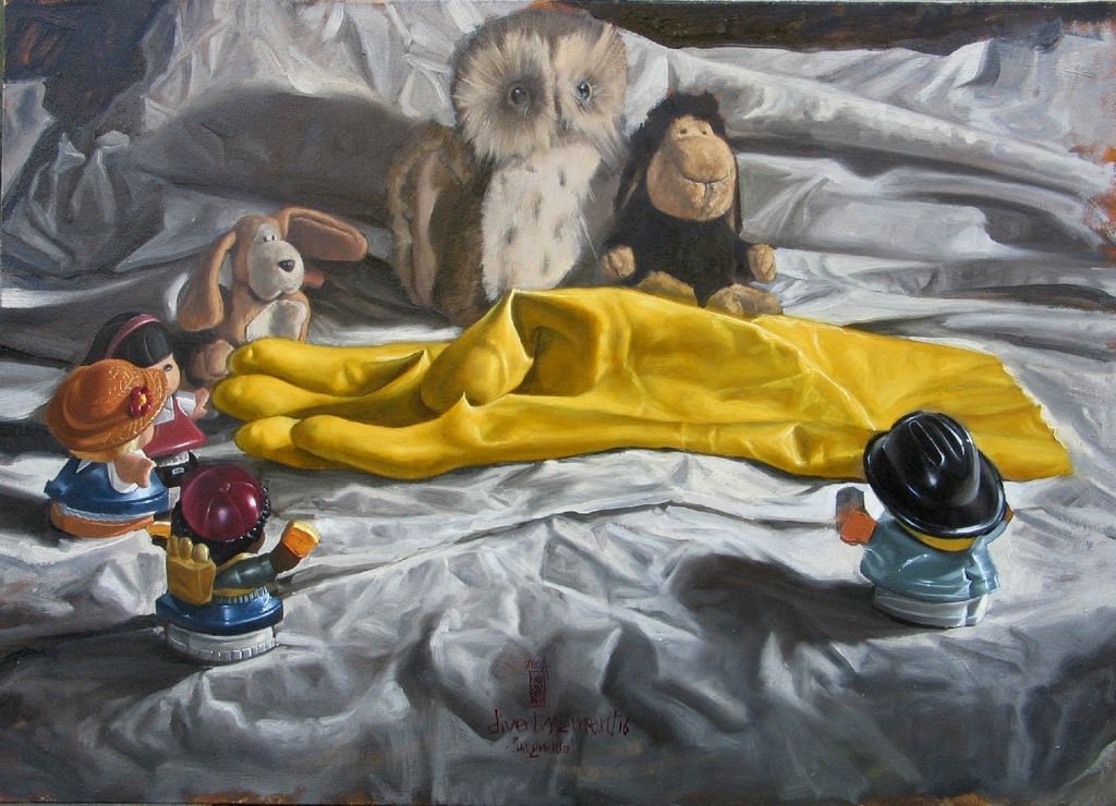 Con questi personaggi sono nati i Divertissement, interpreti di tanti ruoli; un lenzuolo bianco è il palcoscenico, teatro divertito del senso e del non senso. Inquadrature strette per escludere il mondo esterno, per rendere mondo universale il piccolo teatro dei giocattoli, per immergere lo sguardo dentro quelle coordinate, per sistemare noi stessi vicino a quelle pose, per “ragionare” come loro, dentro il “loro mondo”, diverso, ma uguale. Varie le situazioni raffigurate, dalle più ironiche, alla reminescenza letteraria, dalla citazione di grandi artisti (il quadro Il guanto è un omaggio alla serie di incisioni Un guanto di Max Klinger), al ricordo, senza regole se non quelle del gioco.