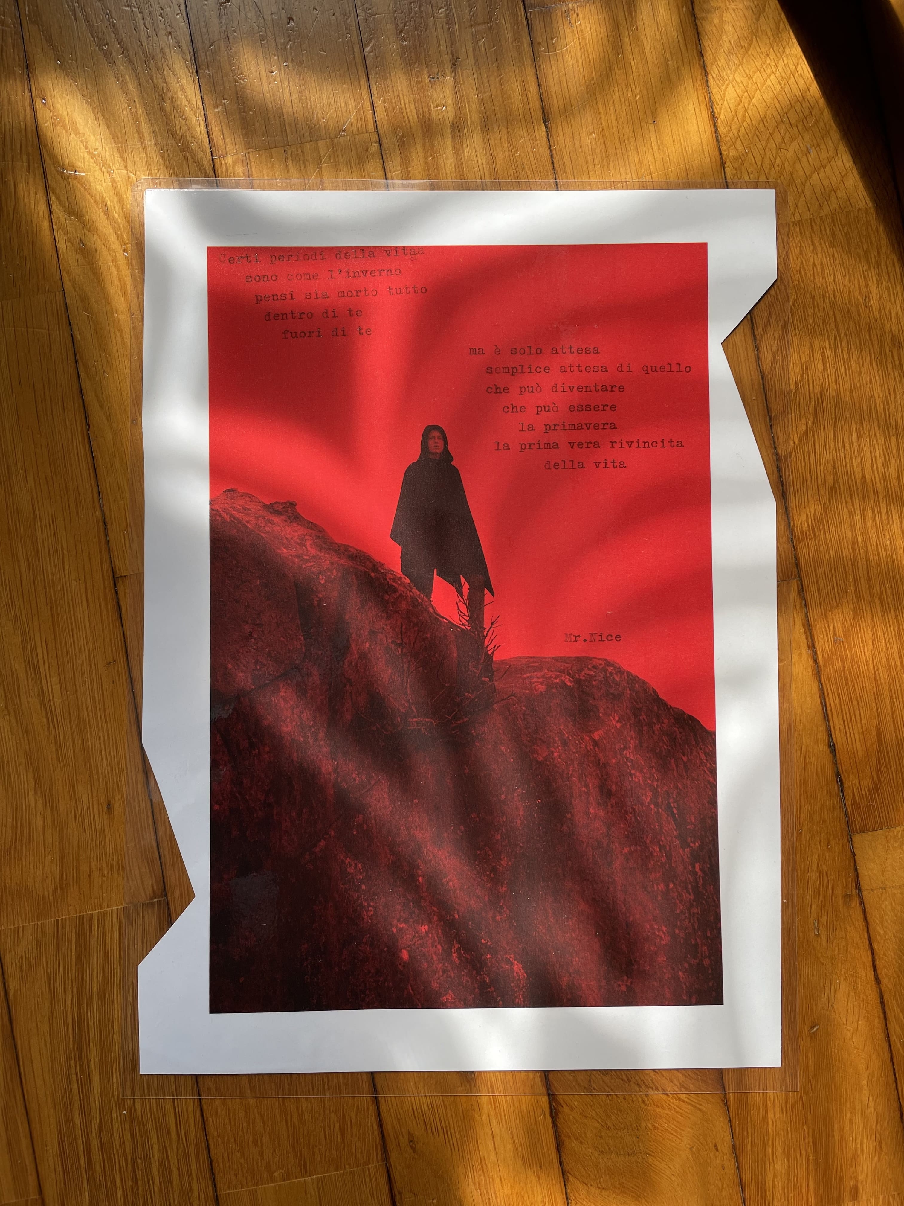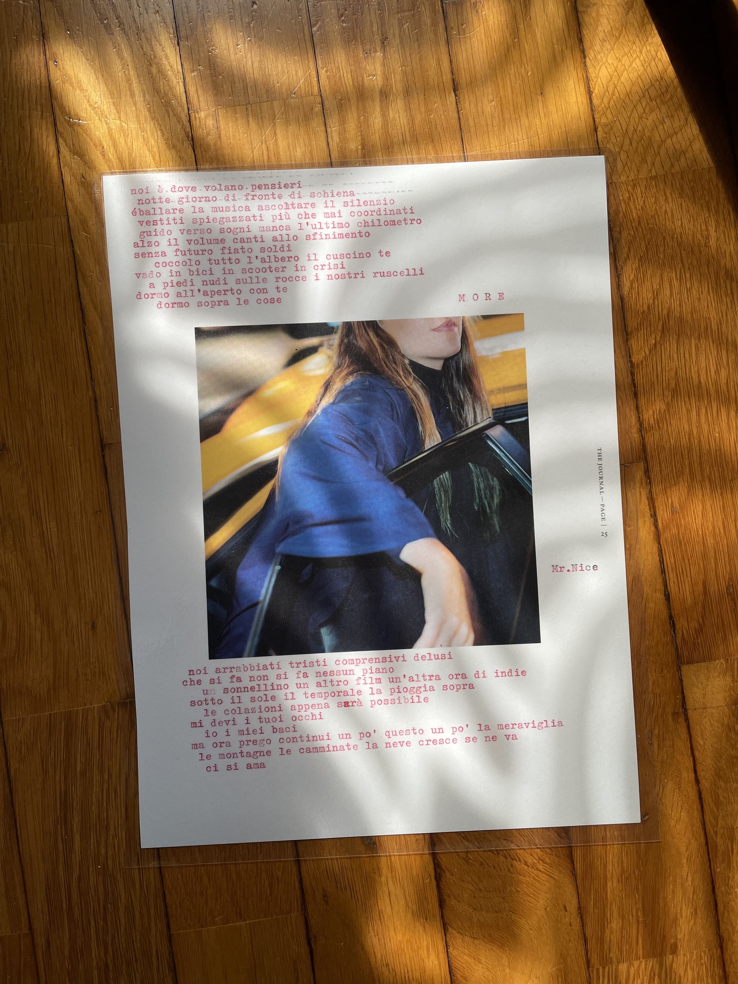 Progetto di arti visive che presenta una raccolta di immagini su cui vengono incise poesie in modo che si crei una simbiosi tra parole e immagini, posizioni e spazi. Alcune delle immagini arrivano da fogli presi da riviste, su cui sono scritte, con la macchina da scrivere, delle poesie originali.
