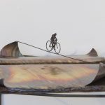 Simbolo universale del sapere e oggetto intimamente naturale, da sua stessa etimologia (da latino liber, la membrana sottile che si trova sotto la corteccia dell’albero), il libro è protagonista di una serie di mirabili opere di Sara Bolzani che compendiano i temi del viaggio, della memoria, del racconto, della cultura. I volumi aperti diventano luoghi, spazi da vivere. L’uomo è presente tra le pagine, che, di volta in volta, si trasformano in strade da percorrere in bicicletta, in mari da navigare, in rampe sulle quali esibirsi con lo skateboard…Tra sogno e realtà, emerge il desiderio di conoscere, di allargare i propri orizzonti, anche attraverso la letteratura (veri e propri omaggi ai grandi classici sono i recenti libri che illustrano Moby Dick, Don Chisciotte, Il vecchio e il mare). Torna in mente sant’Agostino secondo il quale: “il mondo è un libro e chi non viaggia ne conosce solo una pagina”. Le pagine del mondo sono descritte nei Paesaggi scolpiti, liriche cartoline che immortalano alberi scossi dal vento, betulle d’autunno, silenziose pianure, quiete lagune popolate da nobili aironi, gli stessi che sostano sulle pagine dei libri aperti: uno di loro ha abbandonato i compagni e sta per librarsi in volo (una allusione alla ribellione, al pensiero controcorrente), un altro è insidiato da un ippopotamo che avanza di soppiatto (un invito a tenere gli occhi ben aperti, a vivere il presente).