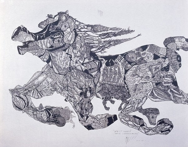 Caleidoscopici e mutanti,i disegni di Mucciaccia costruiscono metamorfosi in divenire.Colgono immagini della vita reale-un cavallo,una donna,un paesaggio-durante un processo di mutazione.Come in un film di fantascienza,le rassicuranti forme del quotidiano si rivelano insospettati contenitori di brulicanti presenze in proliferazione."Forme prendono vita da altre forme"scrive Marziani"..storie dentro altre storie",in una catena di visioni fantastiche che l'artista attinge indistintamente da memoria personale,storia collettiva,passato mitologico e futuro tecnologico,fiaba e scienza..