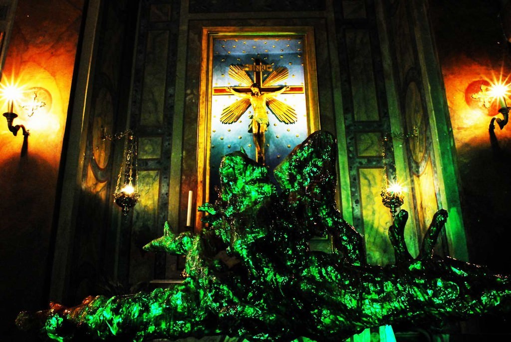 Con la pazienza maniacale di un antico miniatore, con dovizia lenticolare di particolari, di icone e portenti marchiati a fuoco da una squarciante forza evocativa, Mucciaccia dà dunque forma plastica e spaziale all’allucinazione di un essere alieno e mostruoso forse vittorioso o forse ammansito, soggiogato e convertito da una visione escatologica e dal sacrificio cruento di un uomo divino che cambia il destino di un mondo e dei suoi abitanti. Così la bestia che dovrebbe suscitare ribrezzo e orrore si trasforma paradossalmente e dialetticamente nell’allusione a una possibile palingenesi, nella metafora di una salvazione che si allarga a tutto il creato raggiungendo le zone più ombrose e lontane dalla Grazia, immagine simbolica della caduta e della rinascita dell’universo attraversato dalla presenza del Male e rigenerato dalla potenza vitale della Gloria.