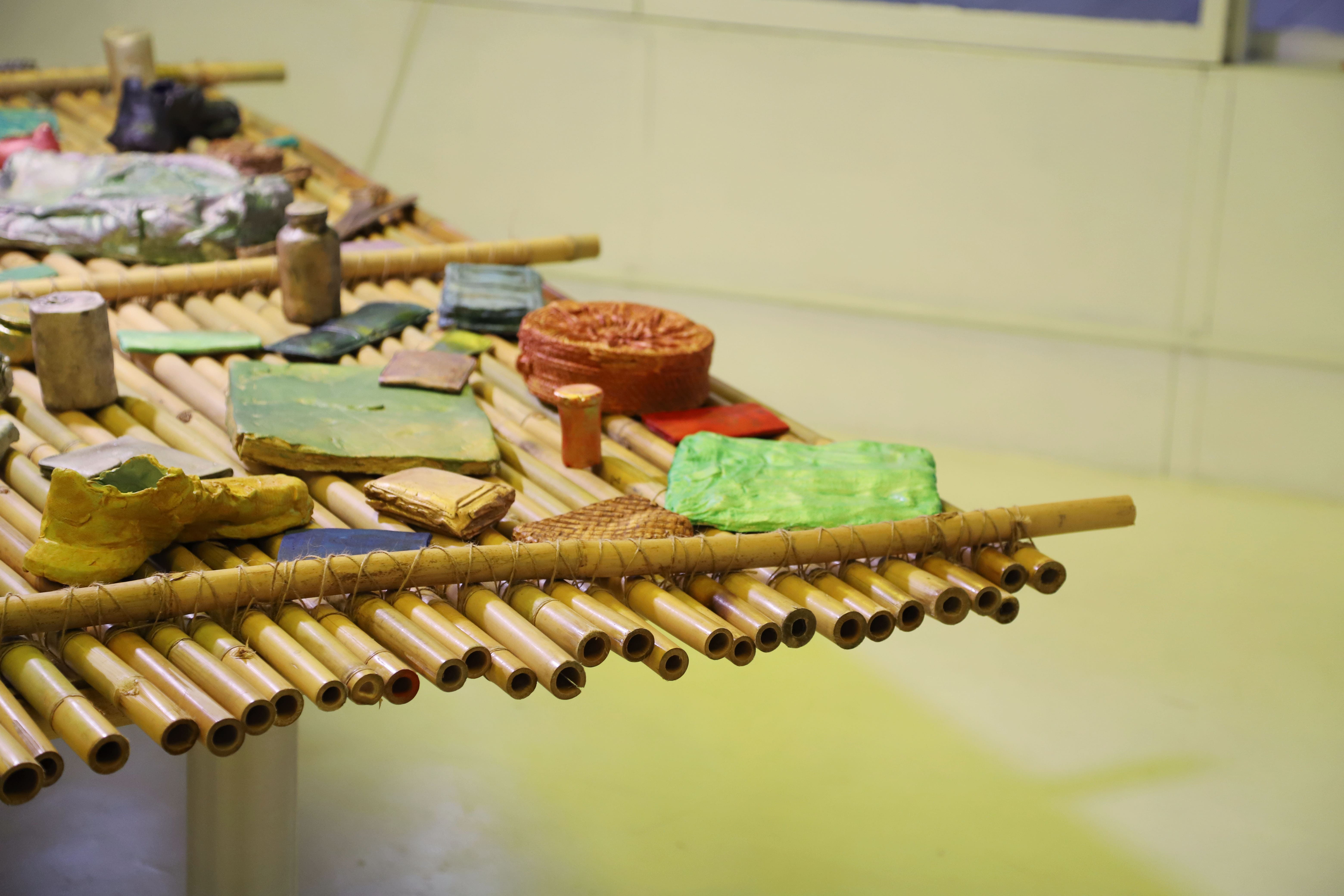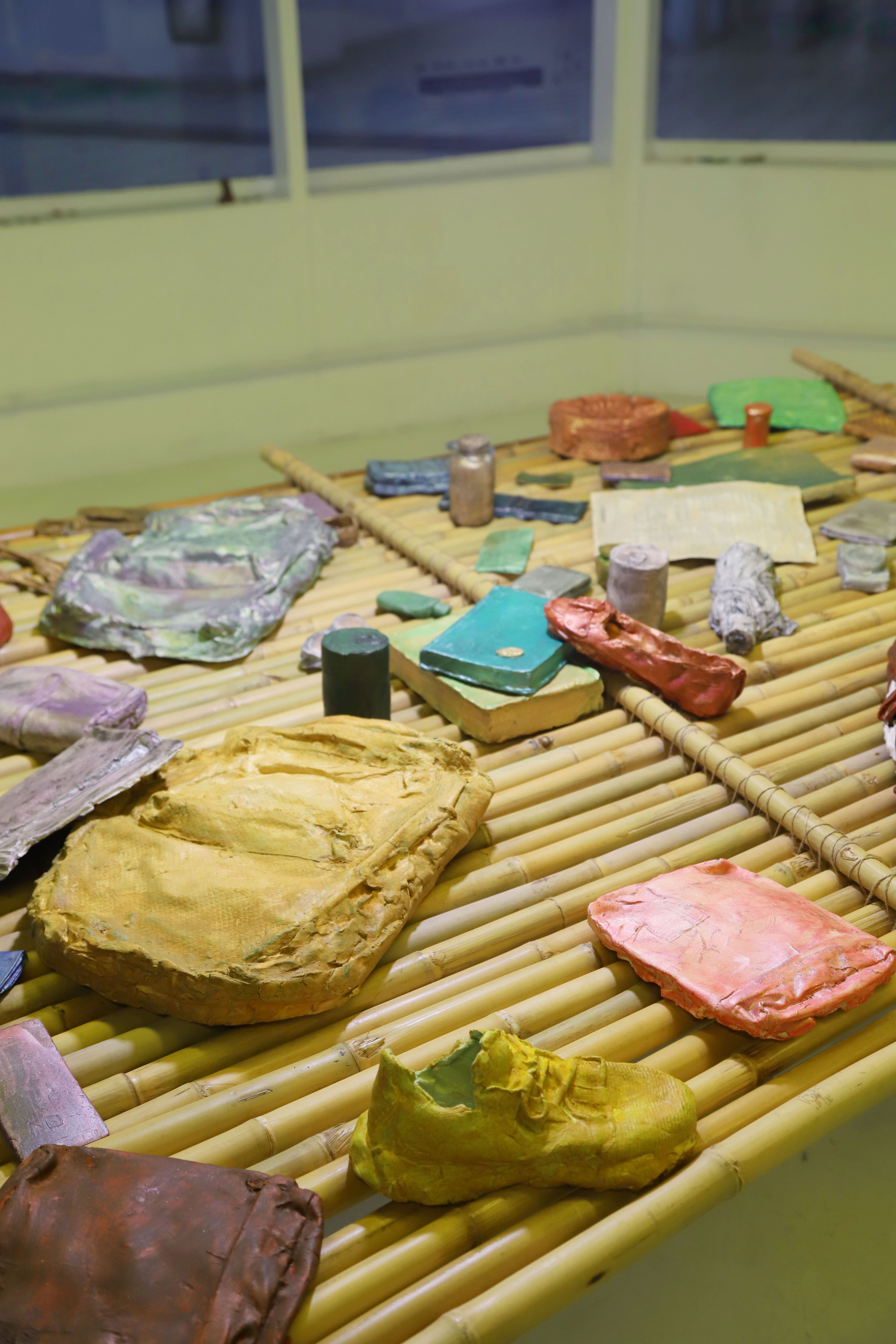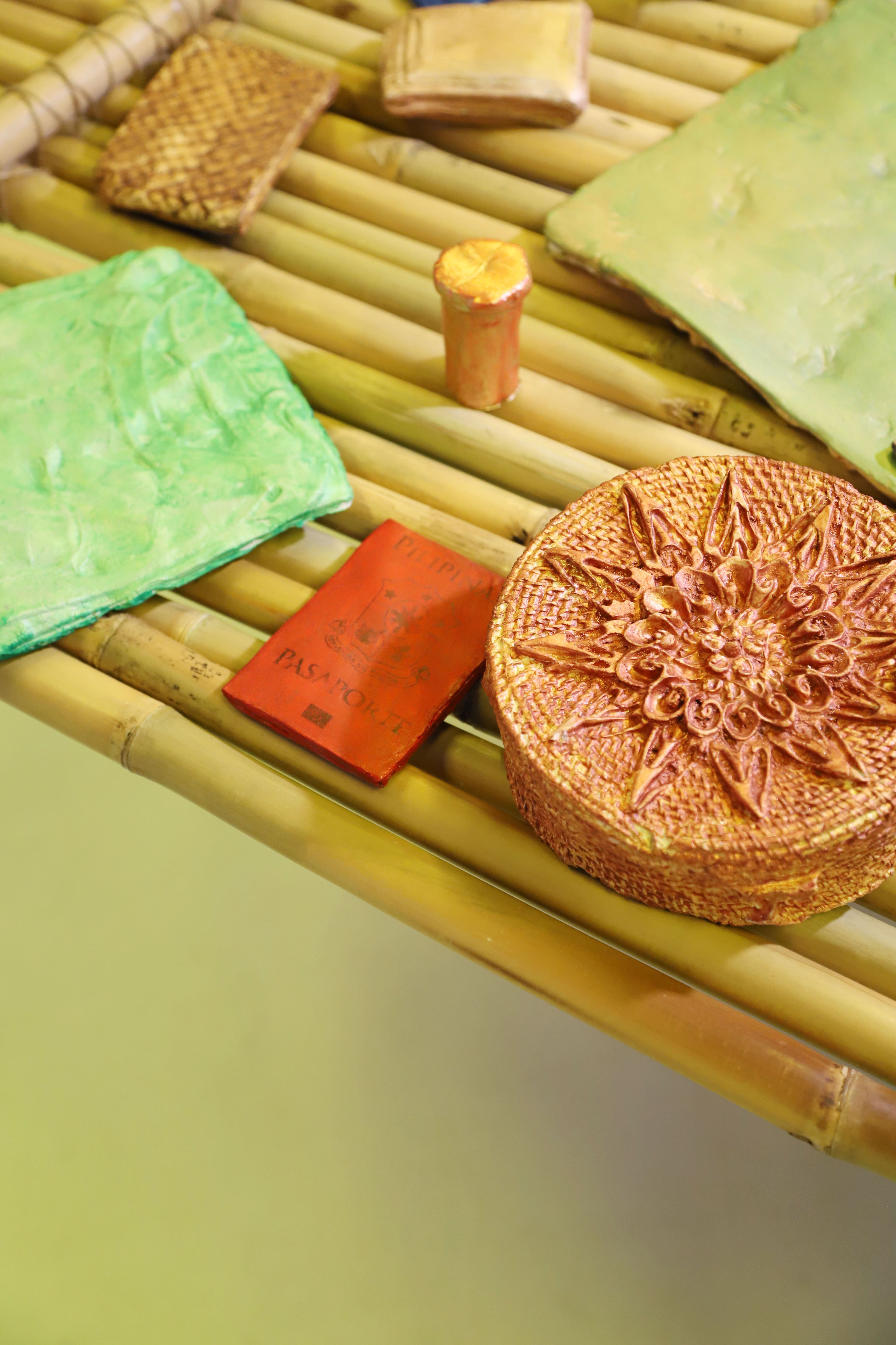 La mostra di Gupit Migrant Belonging(s) immagina un luogo di incontro interculturale e interlinguistico dove persone di diversa provenienza condividono le loro storie di migrazione e diaspora. Il suo progetto è il risultato delle interviste fatte dall’artista a migranti e cittadini di seconda generazione provenienti da Albania, Argentina, Brasile, Egitto, Libano, Filippine, Stati Uniti e Vietnam, le cui famiglie hanno deciso di vivere e lavorare in Italia, alla ricerca di una vita migliore. L’installazione consiste in una serie di calchi realizzati in paperclay, che replicano effetti personali che rimandano a storie e racconti di migrazioni, come passaporti, borse, medicine, scarpe, cibo in scatola, portafogli e documenti - oggetti essenziali per trasferirsi in un nuovo Paese, in aggiunta a quelli che ricordano casa, come descritto dagli intervistati. Questi calchi tutti riuniti sopra una grande superficie ricoperta di bamboo fanno luce sugli sforzi compiuti dai popoli della diaspora per sopravvivere e prosperare nel mondo contemporaneo globalizzato. Scrive Lily Woodruff nel testo critico che accompagna la mostra: “Una delle cose che Gupit ha ascoltato ripetutamente intervistando i suoi soggetti è che i loro effetti personali hanno assunto un nuovo significato nel contesto delle loro nuove realtà. Per questo motivo, Gupit è arrivata a descrivere quegli oggetti nei loro nuovi contesti culturali come "brutte copie" di se stessi. Le repliche in paperclay che realizza creano questo effetto di disfunzione”.