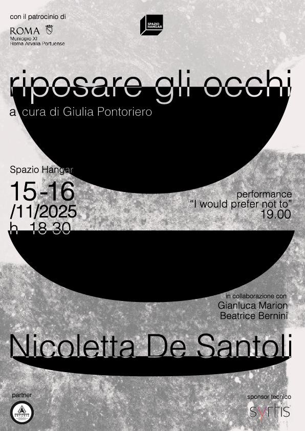 produzione, ma come riconoscimento della propria esistenza attraverso le forme del fare. Il percorso espositivo si articola in forma libera ma tematica: all’interno degli ambienti permanenti di SPAZIO HANGAR, De Santoli, in collaborazione con il sound designer Gianluca Marion, introduce Riposare gli occhi, un'installazione sonora - e titolo della mostra - che ricostruisce una mappa dei suoni della sua camera da letto nel momento prossimo all’assopirsi. Ad uno spazio intimo di semi-coscienza cognitiva si alterna quello visivo, proponendo come cornice Myopia: una sequenza di opere fotografi che, scattate in analogico, inserite all’interno di dispositivi mobili di occultamento, che ne impediscono la lettura visiva complessiva alludendo allo stato percettivo di miopia. A seguire, l’artista si serve del video, ripetuto simultaneamente in più dispositivi, come forma espressiva dell’opera Lavorare stanca: video-karaoke dove al primo articolo della Costituzione Italiana De Santoli sovrascrive alcuni passi di “Distruggiamo il lavoro”, noto saggio di Alfredo Bonanno, interpretato dall’attrice Beatrice Bernini. Riposare gli occhi conclude poi il suo percorso con la pratica performativa I would prefer not to, ospitata all’interno della palestra, dove l’artista invita lo spettatore a sdraiarsi in silenzio, per sondare la capacità dello stesso di abitare l’inattività e il vuoto.