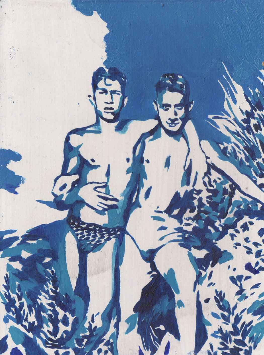 Per la mostra di Nicolò Bruno Dimora Artica diviene metafora di un ambiente protetto dalle battaglie che si svolgono al di fuori di esso, un rifugio in cui l’affetto e la complicità scherzosa delle figure di giovani soldati sorridenti stridono con la ferocia della guerra che li aspetta al varco.