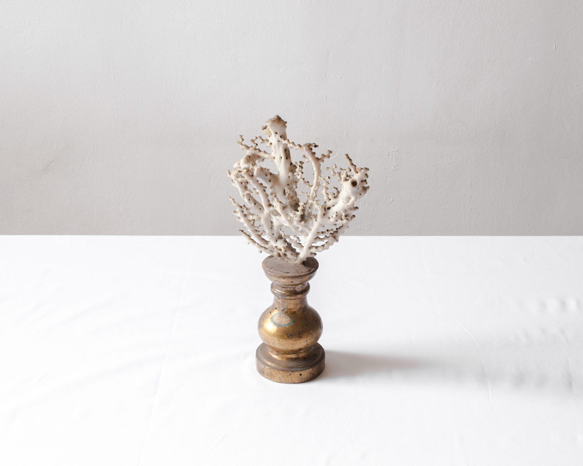 La piccola galleria con affaccio su strada di via Carteria a Modena che ospita la mostra Lโimmagine contraddetta di Nicolรฒ Cecchella e Jacopo Valentini รจ occupata da soli quattro interventi, opere che includono due linguaggi interlocutori ideali del ritratto; fotografia e scultura. Valentini propone due immagini dalla serie Vis Montium (2018 โ ongoing) un antico corallo appoggiato su un sostegno di legno che ancora conserva lโoriginale etichetta a testimoniare un lavoro archivistico che cede allโeleganza calligrafica (dalla collezione Lazzaro Spallanzani conservata nei Musei Civici di Reggio Emilia). Il ritratto della conservazione, i coralli sono pezzi di natura sottratti al proprio habitat ed elevati a sculture pseudo scientifiche. Una classificazione estetizzante, probabilmente ottocentesca, che Valentini ritrae su sfondo bianco: la linea della parete identifica uno stacco con il tavolo su cui รจ appoggiato il corallo, come a ribadire il prelievo che lโartista opera. Sono oggetti appoggiata ad un piano, sono oggetti rubati al mare, sopravvissuti allโinvecchiamento, sono presenze ritratte. Classificate. In questo caso la fotografia ritrae per reindirizzare la funzione dellโoggetto, il corallo non piรน organismo e nemmeno oggetto da collezione, ma immagine, variazione cromatica. Valentini separa una parte dal tutto, una singola parola da un vocabolario, una fuoriuscita furtiva. Poco distante unโaltra immagine dalla stessa serie a restituire il tempo della stagionatura del parmigiano reggiano; un corpo velato, un lenzuolo, una presenza in assenza, tono su tono a confermare la selezione di unโunica forma, di un unico corpo muto.