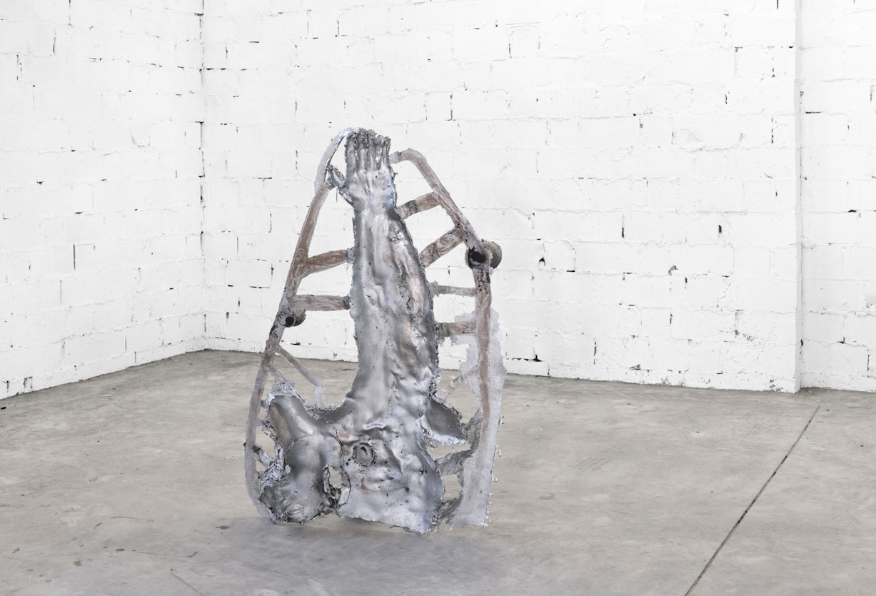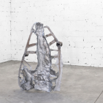 Cecchella asseconda una dimensione materica diversa, alluminio e terracotta; due sculture che allโinterno dello spazio sembrano attrarsi come parte dello stesso corpo, della stessa carne. Un volto sospeso, anzi un calco del viso dellโartista che si fa maschera, filtro per la visione. Lโinterno rivestito in platino accoglie la luce elevando i tratti somatici a luogo di transizione. Lโesterno rimane grezzo, terracotta liscia, come fosse una chiesa bizantina spoglia e modesta nellโinvolucro ed epifanica e riflettente al suo interno. Anche in questo caso un ritratto, una sineddoche del corpo che osserva la scultura a terra: un braccio teso verso lโaltro e ancora il volto, lo spazio del ritratto, una condizione necessaria, archetipica. Dove, come sostiene Cecchella โl'interno chiamato in causa oltre sรฉ stesso, accade come interioritร , passaggio mutevole, luogo di luce e di riflessi che transitano mostrando lโIo e l'Altro, annullando la matrice identitaria in un chiasmo esistenziale anatomico-ottico, che รจ specchiatura e vertigine senza fineโ.
