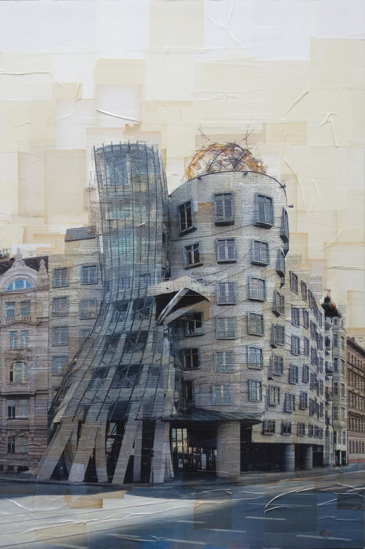 L’inserimento di testi applicati sotto le immagini, coevi agli edifici fotografati, ci riportano all’epoca della loro costruzione. Avvicinandosi alle opere, si percepisce al meglio l’effetto estetico creato dalla sovrapposizione e stratificazione delle pagine di libri d’epoca.
