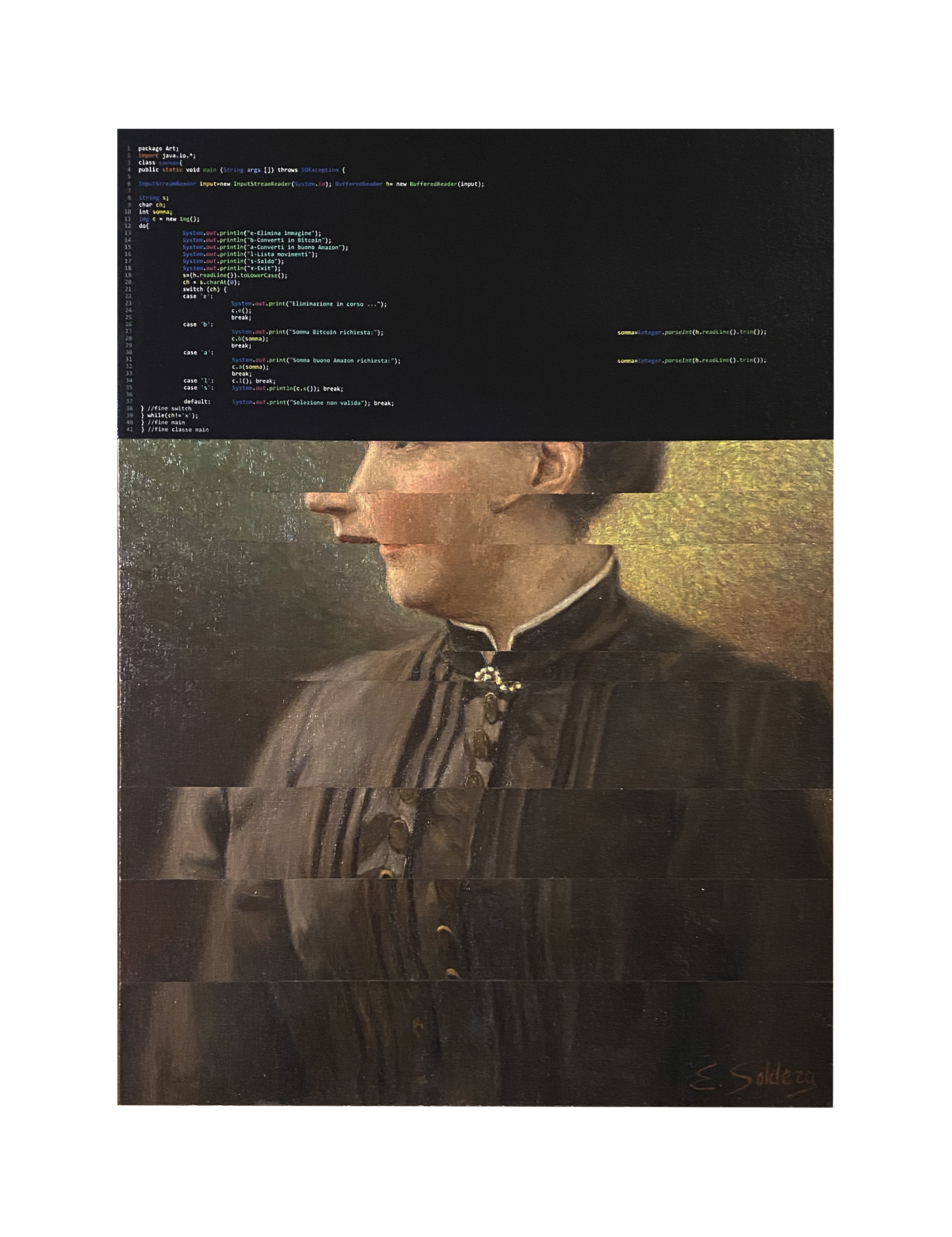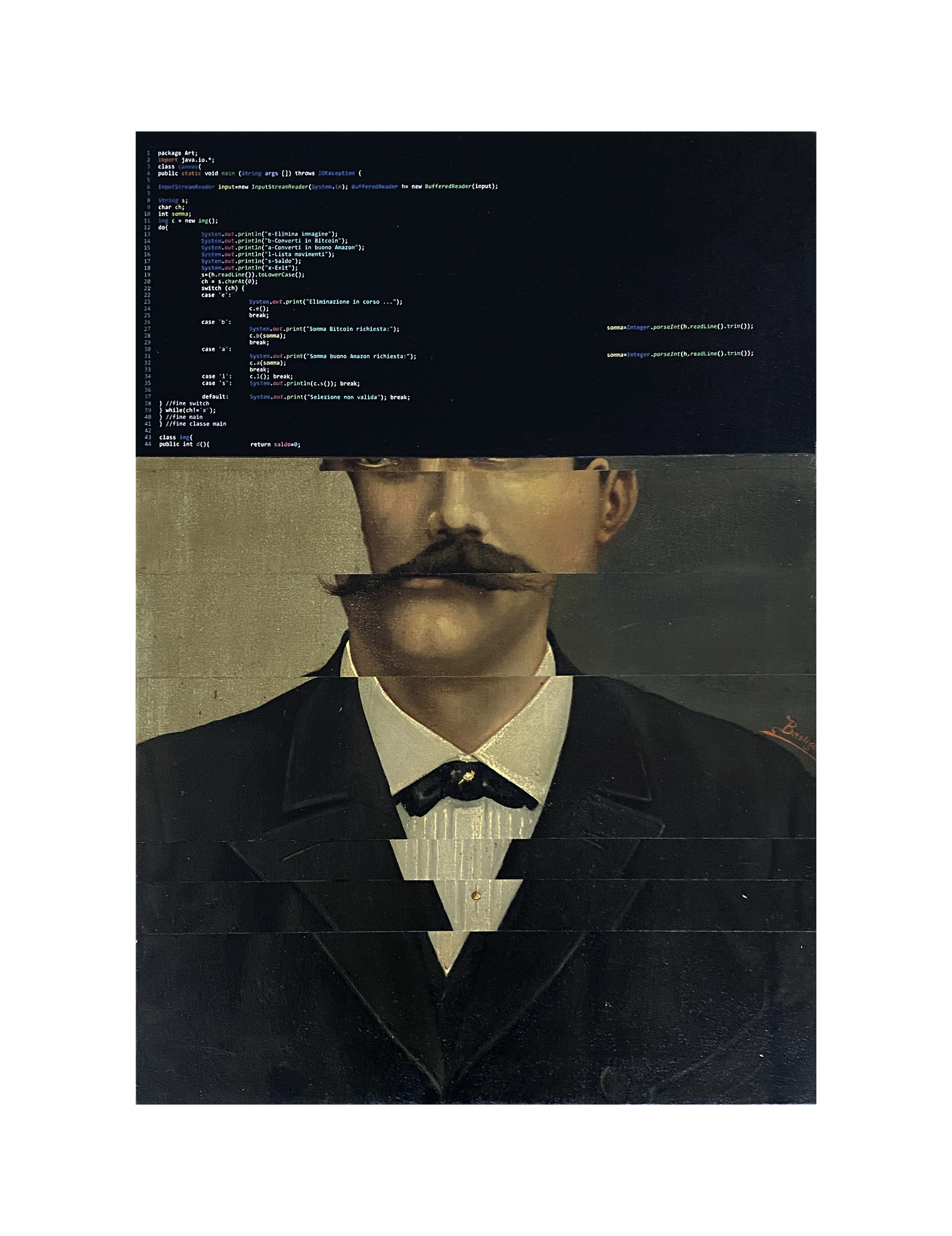 La mediazione della tecnologia si impadronisce poi del tutto della percezione dell’immagine, che deve adattarsi ai tempi e ai processi imposti dai media. Il tema è indagato con interventi su opere originali (vecchi ritratti o paesaggi), che vengono in parte ricoperte per riprodurre l’effetto del caricamento sullo schermo del computer, o su cui sono riportate frecce e barre di scorrimento, o – nella serie Petrolio – pubblicità di siti di incontri o gadget sessuali. Lo stesso intento hanno gli studio for a loading, in cui le immagini di noti capolavori del passato sono impresse su lastre di metacrilato trasparente, fissate nella fase del “caricamento” sullo schermo, e quindi tanto sfuocate da essere appena riconoscibili; altre volte tali immagini sono realizzate dipingendole manualmente sugli schermi di veri tablet, inane tentativo di riportare in primo piano la manualità artigianale. Nella più recente serie Silicio il quadro si divide in una parte in cui l’opera originale è materialmente scomposta, come in fase di annullamento, e una in cui sono riportati i caratteri digitali del codice sorgente che contiene gli algoritmi di distruzione dell’immagine.