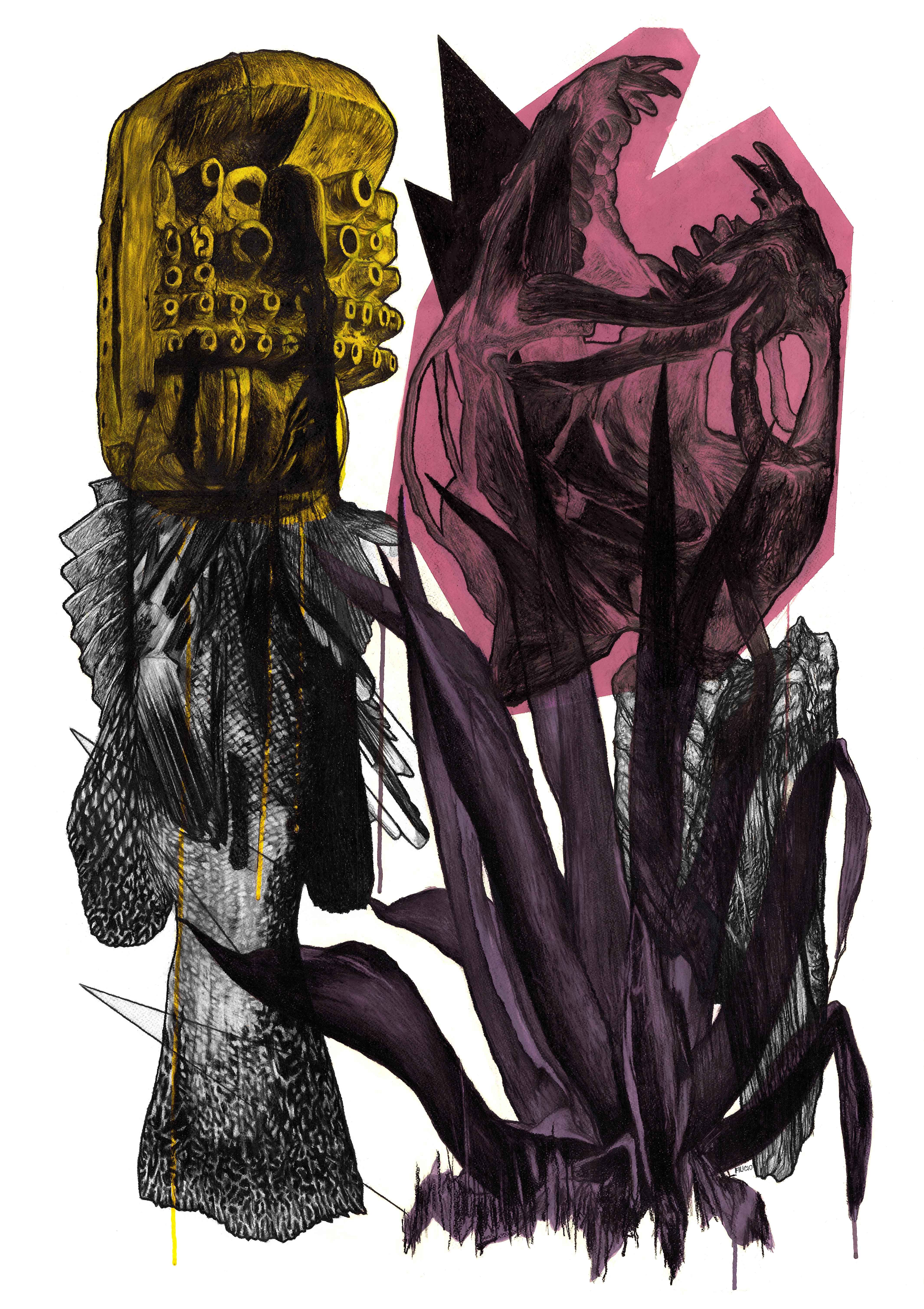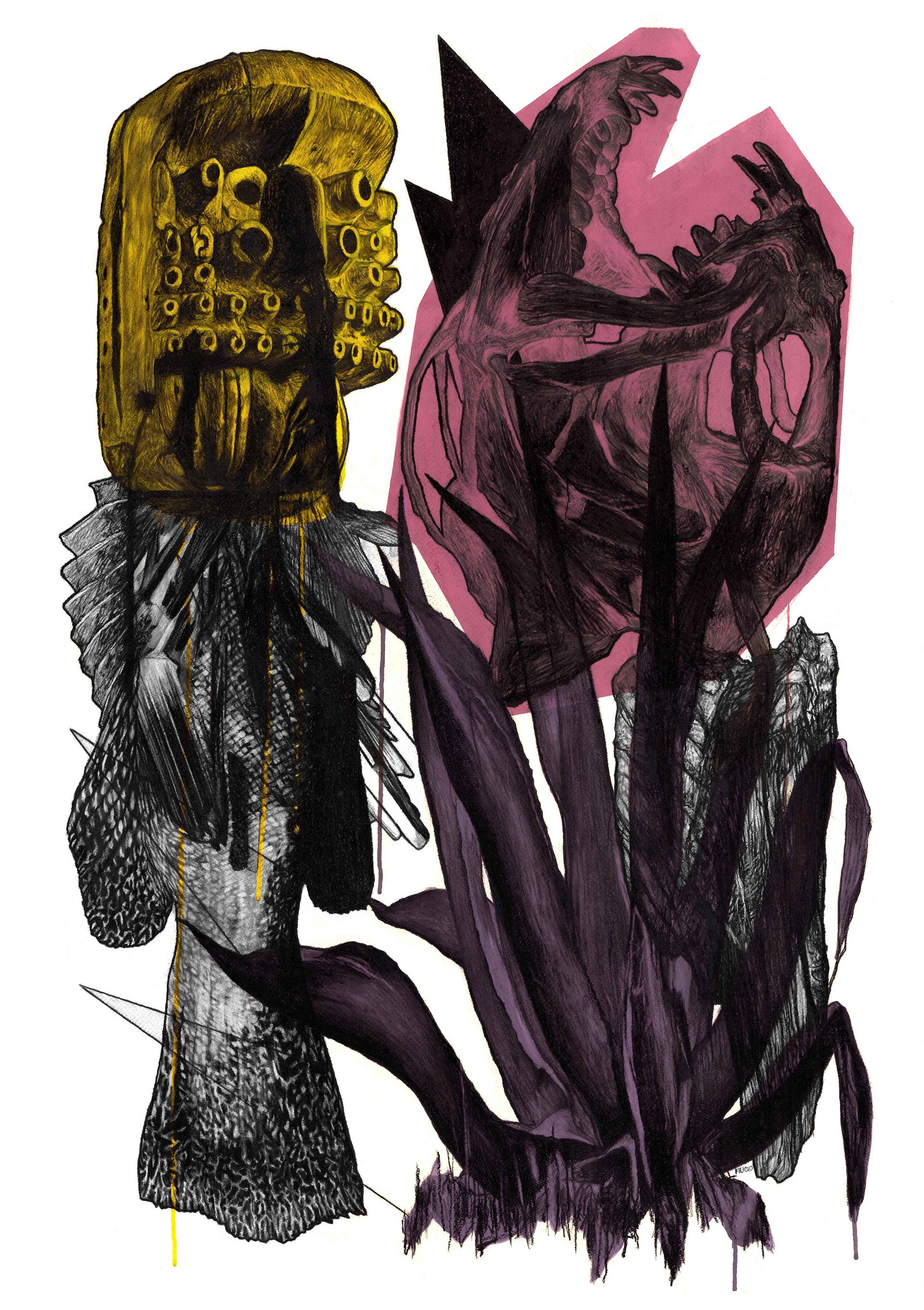 E così Nutriartun, titolo di una delle opere in mostra, è una creatura che, come il palindromo del suo nome, si rovescia su se stessa e si ibrida con il muso di un babbuino, le orecchie di un pipistrello, un grappolo di funghi ed elementi marini. Hexe è un demone di paglia con la bocca spalancata al suo mal di vivere e Patatoad è un mostro anfibio fatto di spine, rami di coralli e pezzi di conchiglia.
