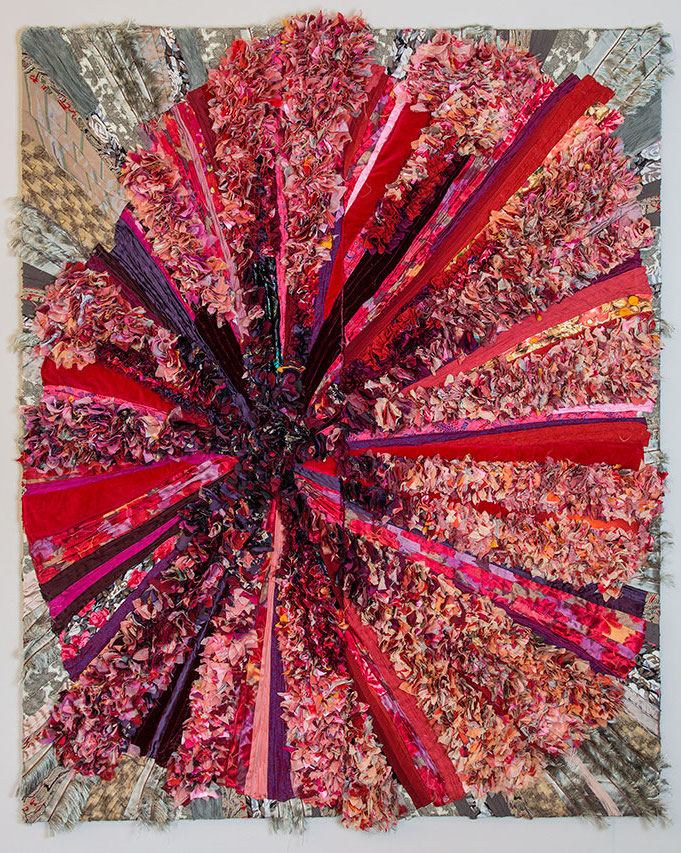 “Corpi tessili, spazi emotivi” affronta una riflessione sul femminile inteso non come essenza ma come esperienza: la donna diviene una forma molteplice, non definita in modo univoco e anzi in grado di rinnovarsi continuamente. L’artista rappresenta il corpo non solo come figura, ma come territorio mutevole. In “Female Warmth” esso si fonde in un vortice organico, una natura ancestrale e ciclica. Nika Nuova lavora con stoffe che evocano la carne e che diventano il linguaggio non per costruire un’identità, ma per decostruirla e indagarne le relazioni. L’opera “Ode al lavoro femminile” pone invece l’attenzione sul valore, spesso trascurato, del lavoro quotidiano delle donne. Il grande pannello ricamato in punto croce ritrae un seno, ed è il frutto di un’eccezionale collaborazione tra l’artista e oltre trenta donne, una piccola fatica quotidiana collettiva.