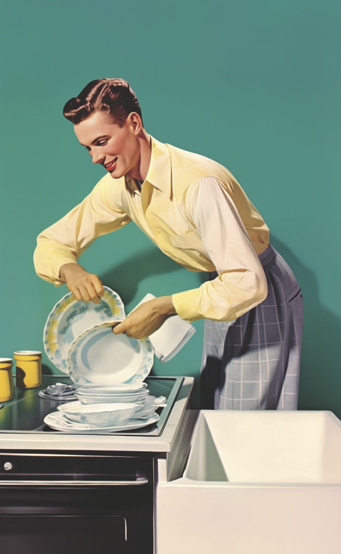 Nikzone, dopo un lungo lavoro di ricerca iconografica sugli anni cinquanta, sulle riviste femminili dell’epoca, di studio della loro grafica, del linguaggio e dei contenuti, ci mostra i perfetti casalinghi nelle loro azioni domestiche quotidiane, sempre amabili, remissivi, sorridenti e acchittati in modo impeccabile. Uomini che usano i nuovi elettrodomestici come la lavatrice, l’aspirapolvere, il frullatore, celebrati da Nikzone come icone in stile Pop, isolati dal loro contesto e poi reintegrati nella ricostruzione dell’ambientazione.