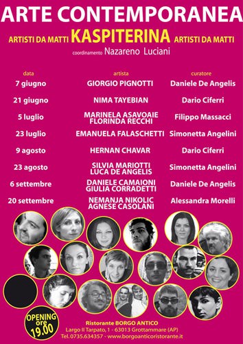 La rassegna proseguirà per tutta l’estate al Borgo Antico proponendo i lavori di Marinela Asavoaie, Florinda Recchi, Emanuela Falaschetti, Hernan Chavàr, Silvia Mariotti, Luca De Angelis, Daniele Camaioni, Giulia Corradetti, Nikolic Nemanya e Agnese Casolani. Gli artisti si confronteranno con giovani curatori e intellettuali: Simonetta Angelini, Dario Ciferri, Daniele De Angelis, Filippo Massacci, Alessandra Morelli che si avvicenderanno nella presentazione degli artisti.