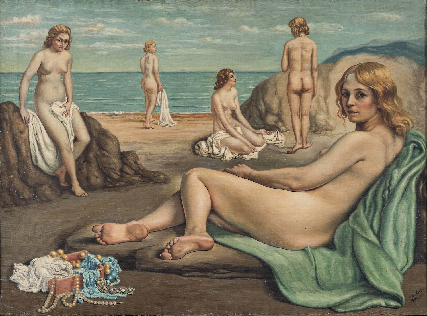 Altra opera fondamentale è quella di Giorgio de Chirico Bagnanti sopra una spiaggia (1934) in cui, tra sogno e realtà, vengono rappresentate figure femminili (con un occhio da Tiziano a Ingres), in un contesto sospeso tra realtà metafisica e quotidiano.