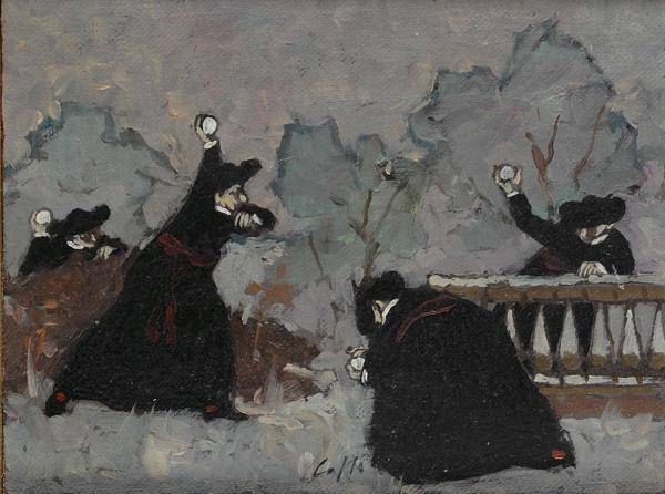 Nino Caffè, il pittore dei pretini, come da tutti viene definito, rende protagonista dei suoi dipinti quel clero di provincia becero e credulone che si fa scandalizzare da una veste femminile o da qualche diavoletto svolazzante spuntato all'improvviso da chissà dove, che Caffè si diverte a satireggiare a partire da una scelta cromatica scopertamente anticlericale: il rosso.