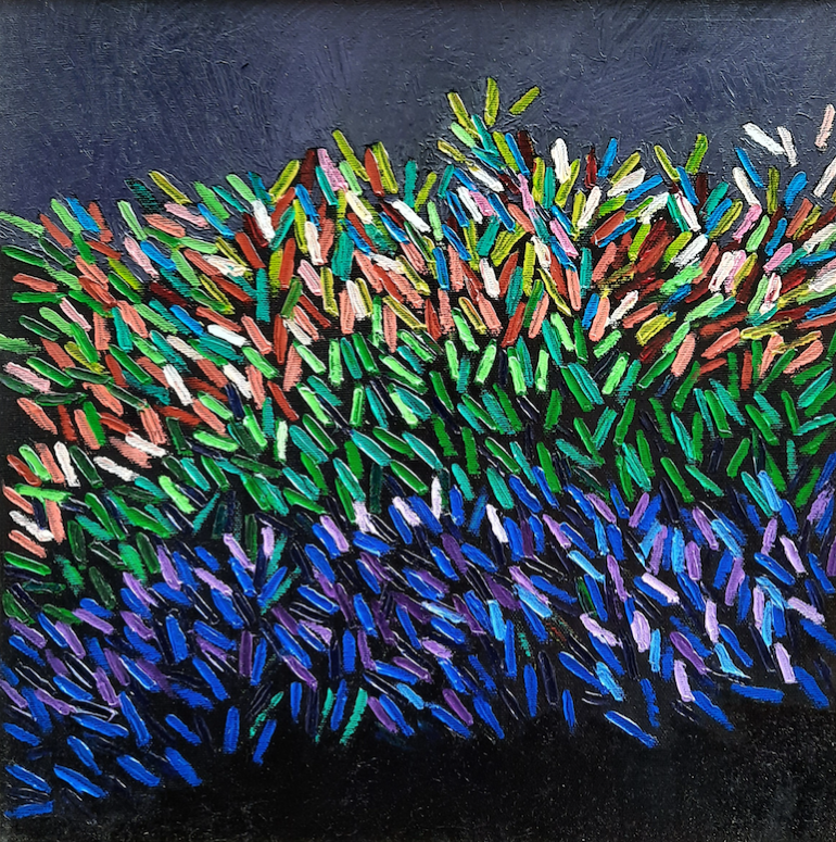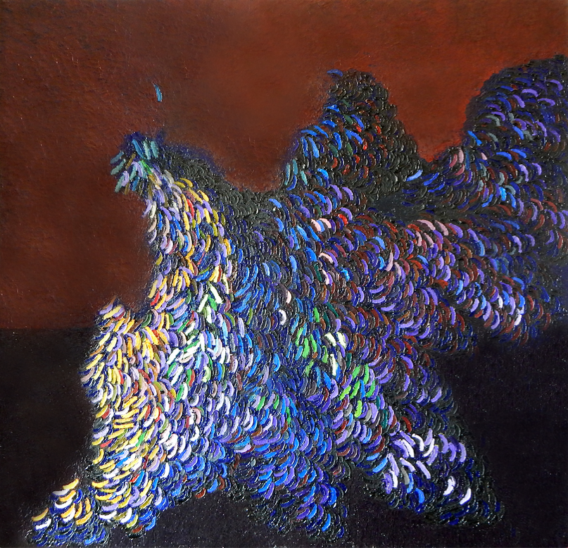 UN’ESPOSIZIONE DI 12 TELE AD OLIO E 10 SERIGRAFIE TUTTE RITOCCATE A MANO DALL’AUTORE con colori e pastelli ad olio, e nuovi dipinti realizzati per l’occasione come, Lagotto e Organismo vivente, opera prediletta dall’artista perché: “esalta la natura in ogni sua caratteristica vivacità e forma un insieme di armonia pittorica che rende piacevole la vista di chi osserva.” La tela, preparata con stucco e colla, è stata dipinta con la spatola per fare in modo che ogni colore diventi gestuale e anche protagonista.