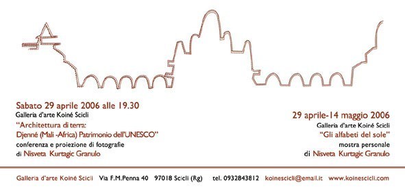 La Galleria d’arte Koiné Scicli presenta sabato 29 aprile alle 19.30 la conferenza :”Architettura di terra, Djenné (Mali -Africa), Patrimonio dell’UNESCO”, di Nisveta Kurtagic Granulo.