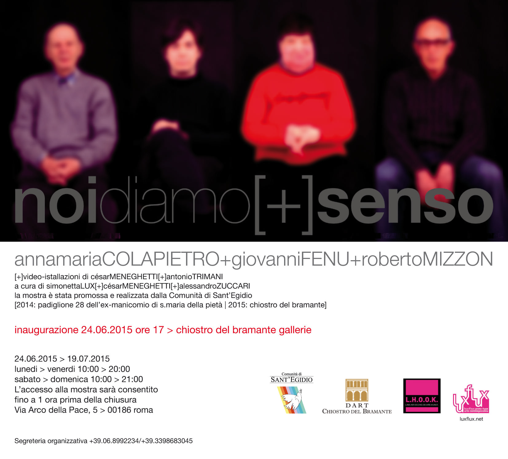 NOI DIAMO [+] SENSO è la concretizzazione e un ulteriore sviluppo del progetto IO _IO È UN ALTRO di César Meneghetti, nel quale Giovanni Fenu, Annamaria Colapietro e Roberto Mizzon – tre artisti usciti da istituzioni reclusorie - si sono interfacciati con artisti professionisti, realizzando una mostra corale nell'ambito del centenario dell'apertura del più grande manicomio d’Europa: il Santa Maria della Pietà di Roma. La mostra - promossa e realizzata dalla Comunità di Sant'Egidio - è stata aperta nel novembre 2014 nel padiglione 28 del comprensorio di S. Maria della Pietà in collaborazione con la ASL Roma E, cioè nel luogo dove i tre artisti dei Laboratori d’Arte erano stati un tempo reclusi: oggi viene ripresentata, su invito, al Chiostro del Bramante.