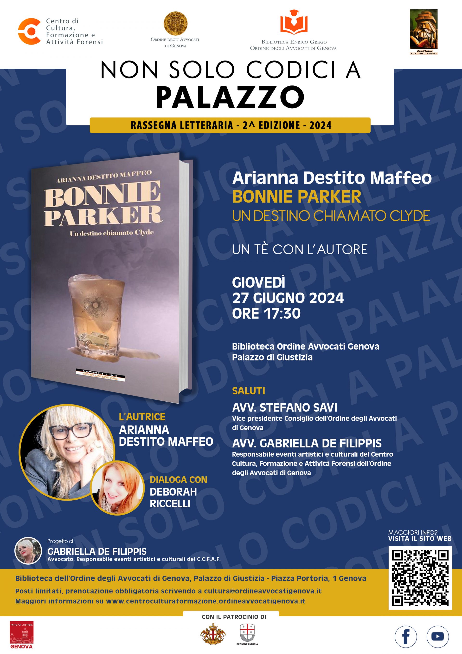 Il 27 giugno 2024, alle ore 17,30, nei locali della Biblioteca Enrico Grego sita all’interno della sede principale dell’Ordine degli Avvocati di Genova, presso il Palazzo di giustizia, si terrà l’ultimo incontro del mese di giugno della seconda edizione della Rassegna letteraria dal titolo Non solo Codici a Palazzo- Un tè con l’autore, incontri che ormai si tengono una volta alla settimana, sempre di giovedì, in presenza di uno scrittore di libri prevalentemente di narrativa.