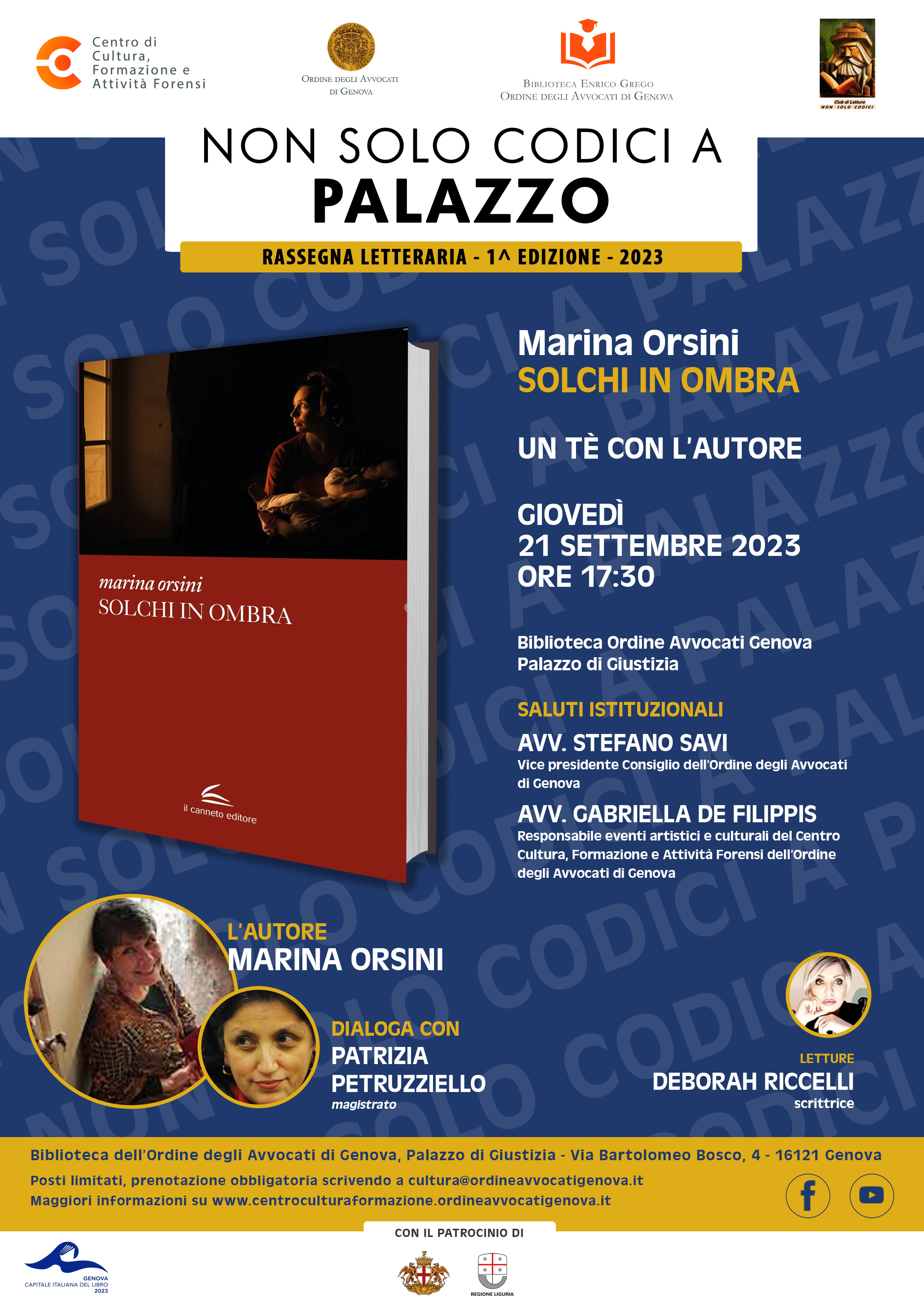 Il 21 settembre 2023 alle ore 17,30 nei locali della Biblioteca Enrico Grego sita all’interno della sede principale dell’Ordine degli Avvocati di Genova, presso il Palazzo di giustizia, si terrà il secondo incontro di detta rassegna e questa volta a “dialogare” con l’autore, o meglio, l’autrice, sarà la dott.ssa Patrizia Petruzziello, Sostituto Procuratore presso il Tribunale di Genova, che commenterà il libro SOLCHI IN OMBRA, scritto dalla dott.ssa Marina Orsini, magistrato e componente del Tribunale del Riesame di Genova, mentre Deborah Riccelli, autrice e attrice, che solitamente nel progetto è colei che “dialoga” con gli autori, in questa occasione leggerà alcuni brani tratti dal libro presentato.