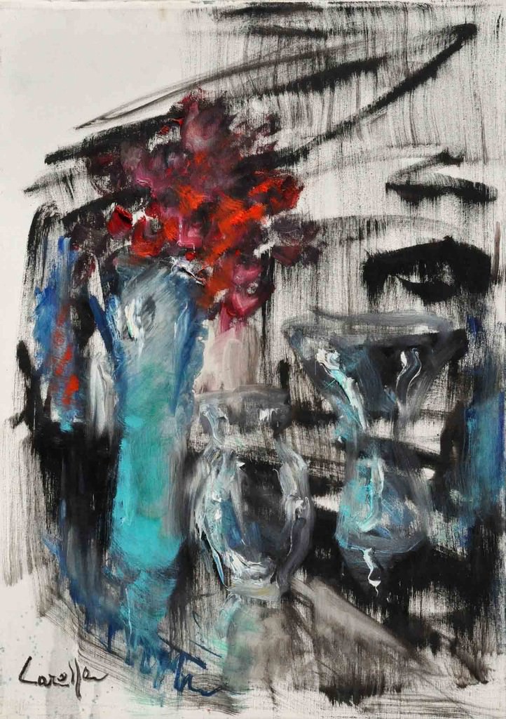 Una sezione della mostra è dedicata alle nature morte di vetri e di fiori, un’altra al paesaggio d’acqua, in prevalenza ispirati alle vedute lagunari e di Venezia, che l’artista dipinge spesso a memoria, usando, a volte, soltanto le dita.