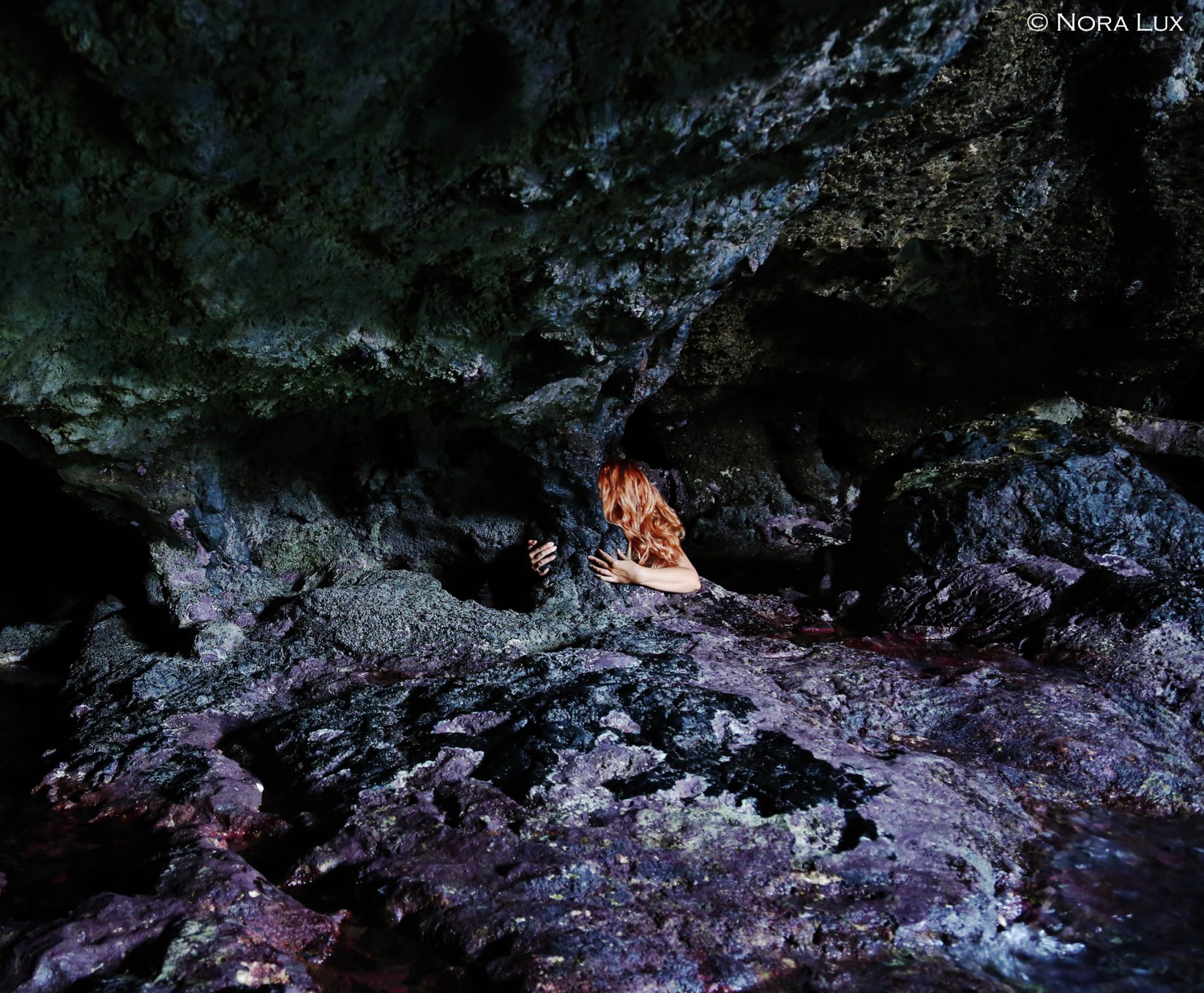 Quindici anni di ininterrotto lavoro nelle cavità e nelle profondità della terra per narrare la storia del femminile nella nostra anima: il percorso artistico di Nora Lux inizia con opere in bianco nero in pelllicola e prosegue con immagini di se stessa come Dea Madre nelle vie sacre e negli ipogei degli etruschi. Il lavoro evolve successivamente in azioni performative che, nell’approccio dell'autrice, rappresentano il naturale sviluppo degli autoscatti. L'originalità di queste "Azioni" consiste nell'essere veri e propri rituali di sintonizzazione con le energie dei luoghi, riti che possiedono la funzione di immergere l'artista nell'inconscio collettivo e nel consentirle di conquistare e trasmettere al pubblico frammenti di una nuova conoscenza. Proprio nel corso di una di queste “azioni”, infatti, mentre assumeva la ieratica posizione della potente Dea Madre, l'artista ha trovato il riferimento Totemico: un corvo, simbolo dello stato iniziale dell'opus chiamato "Nigredo". Da questa dimensione di oscurità, Nora Lux ha integrato nuove figure di comunicazione spirituale tra la terra e il cielo, come il pavone (Albedo) e l'aquila (Rubedo), simboli di trasformazione presenti nel suo Vitriolum (2017-2019).