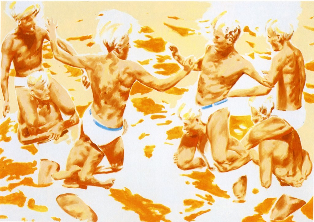 Si inaugura il 7 ottobre presso lo Studio d’Arte Cannaviello di Milano la prima personale italiana di Norbert Bisky. Nato a Lipsia nel 1970, è stato allievo di Georg Baselitz all’Accademia di Belle Arti di Berlino. Oggi è uno dei giovani artisti tedeschi più interessanti e richiesti nel panorama della pittura internazionale, come dimostra un già nutrito curriculum, che lo vede protagonista di numerose mostre in germania (Berlino, Düsseldorf, Stoccarda, Colonia, Monaco) e di una recente personale a New York. Il lavoro di Bisky rintraccia le costanti formali che legano certa iconografia appartenente al regime socialista della ddr (il clima in cui l’artista trascorre gli anni di infanzia), a immagini utilizzate dalle moderne strategie di marketing pubblicitario, a stilemi dell’iconografia nazista. Figure ossessive di uomini biondi, occhiazzurri, muscolosi, discostate dai loro significati politico-economici, rimangono come i rifiuti di un’iconologia dittatoriale, come l’involucro svuotato di un cliché. Ed è proprio in questo scarto che può aprirsi nuovamente un orizzonte artistico, perché, come ha dichiarato lo stesso Bisky in un’intervista, “se l’arte viene utilizzata come obiettivo per fare pubblicità, per un detersivo o per il comunismo, viene abusata. Se si sopprime l’obiettivo, l’arte rimane.” I colori solari, le scene idilliache, una diffusa tonalità brillante e pop, mescolano pacifiche memorie di libri d’infanzia, di illustrazioni degli anni cinquanta e sessanta, a una sinistra sensazione di sotterraneo totalitarismo. Testo in catalogo di alberto fiz.