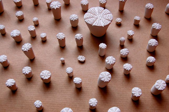 Nell’opera di Federica Ferzoco si legge il fascino che l’artista vive per il mondo naturale. Piccoli elementi di terracotta, evocativi del mondo vegetale, sono disposti secondo un disegno non casuale ma che si riferisce a realtà invisibili riferibili a leggi biologiche. Nell’installazione parietale le ombre portate, passibili di mutevolezza secondo la variazione, l’intensità, il posizionamento della fonte luminosa, assumono la medesima importanza degli elementi scolpiti.