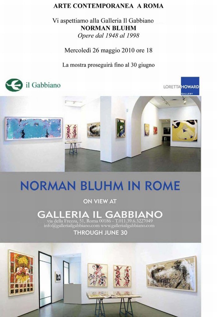 Norman Bluhm nasce nel 1921 a Chicago, già dall’adolescenza si interessa di arte e dopo aver concluso le scuole superiori diviene il più giovane allievo di Mies van der Rohe all’Armour Institute of Chicago. Per tre anni studia con rigore l’architettura moderna, esercitandosi in disegni architettonici meticolosamente dettagliati. Scoppiata la guerra, Bluhm si arruola diventando pilota e partecipa a molte missioni sul Nord Africa e sull’Europa. Dopo la guerra, Bluhm riprende gli studi di architettura, ma sa perfettamente che non può più tornare alla vecchia vita, la guerra lo ha cambiato e rimarrà nei suoi pensieri ancora per molto tempo dopo essere partito per l’Europa per inseguire la carriera artistica. Nel 1947, dopo aver trascorso un breve periodo in Italia, si trasferisce a Parigi e fa parte di quel gruppo di artisti e scrittori americani che dopo la fine della seconda guerra mondiale hanno scelto per varie ragioni di stabilirsi nella capitale francese. Durante il periodo trascorso a Parigi, Bluhm stringe amicizia con vari artisti, condivide lo studio con Sam Francis ed ha modo di conoscere Joan Mitchell. Si trova dunque al centro di una comunita internazionale. Alla fine degli anni Cinquanta torna a vivere e a lavorare a New York . Come numerosi giovani artisti, tra cui gli scultori John Chamberlain, Mark di Suvero e la pittrice Joan Mitchell, Bluhm è influenzato ed ispirato da Pollock, Willem de Kooning e Franz Kline. Malgrado le ovvie differenze esistenti tra loro, ciò che li accomuna e che diventa importante nell’approccio che caratterizza Bluhm, è la loro costante dedizione al disegno, tutti e tre disegnano nei loro dipinti. Per Bluhm il disegno è fondamentale: è sia il punto di partenza che il motore della sua arte. In quasi cinquant’anni di lavoro Norman Bluhm ha creato quattro distinti nuclei di opere, quattro fasi diverse ciascuna delle quali dura più o meno un decennio. Il suo obiettivo è stato sempre perfettamente chiaro: creare dipinti che esprimessero la sua visione spirituale nel modo più profondamente umano possibile e precisamente con grande stile e profondo senso drammatico. L’ultimo periodo della sua attività va dalla metà degli anni ’80 sino alla sua morte, avvenuta nel febbraio del 1999. Se prima optava per una forma centrale attorniata da forme più piccole, ora sceglie grandi composizioni, suddivise in una molteplicità di sezioni, ognuna delle quali ha una propria autonomia eppure è parte integrante dell’opera. Norman Bluhm è ritenutouno degli esponenti più significativi dell’Espressionismo astratto americano insieme a Brooks, Dugmore e Di Suvero. Sue opere sono presenti musei e collezioni pubbliche, tra questi il Metropolitan Museum of Art , il Whitney Museum of American Art e il Museum of Modern Art di New York.