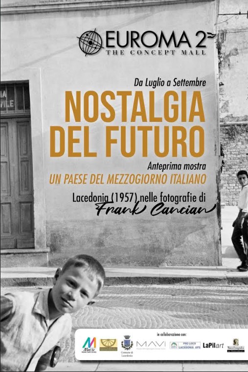 Dal prossimo 20 luglio sino alla fine di settembre 2020 Euroma2 (Centro Commerciale Euroma2- Viale dell’Oceano Pacifico, 83 – 00144 ROMA www.euroma2.it) ospiterà l’esposizione “Nostalgia del Futuro”, anteprima della mostra fotografica “Frank Cancian – Un Paese del Mezzogiorno Italiano. Lacedonia, 1957”. La mostra, curata da Francesco Faeta, avrà luogo al Museo delle Civiltà di Roma dal 10 ottobre 2020.