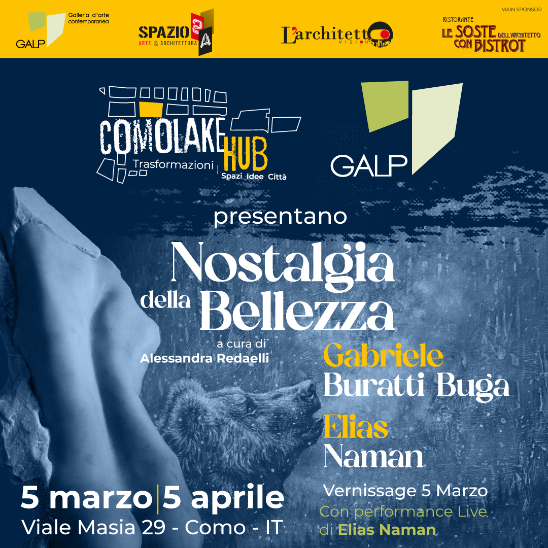 Dal 5 marzo al 5 aprile 2026 il COMO LAKE HUB di Viale Masia 29 a Como ospita la galleria GALP che presenta “Nostalgia della bellezza”, mostra bipersonale di Gabriele Buratti Buga ed Elias Naman a cura di Alessandra Redaelli. Il vernissage, a ingresso libero su prenotazione, si terrà giovedì 5 marzo dalle ore 18:00 alle ore 20:30; la mostra sarà poi visitabile dal lunedì al venerdì, dalle ore 14:30 alle ore 17:00, per tutta la durata dell’esposizione, con ulteriore apertura straordinaria sabato 07 marzo dalle 10:00 alle 13:00 e dalle 14:00 alle 18:00.