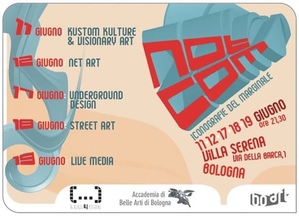 Not Com è un ciclo di eventi prodotto da Boart e organizzato dal Corso di Teoria e Metodo dei Mass Media dell’Accademia di Belle Arti di Bologna (prof. Carlo Branzaglia), dedicato quest’anno al tema Iconografie del marginale, ovvero agli immaginari off della comunicazione visiva (dal tag writing ai live media, dai comics underground alla psichedelica).