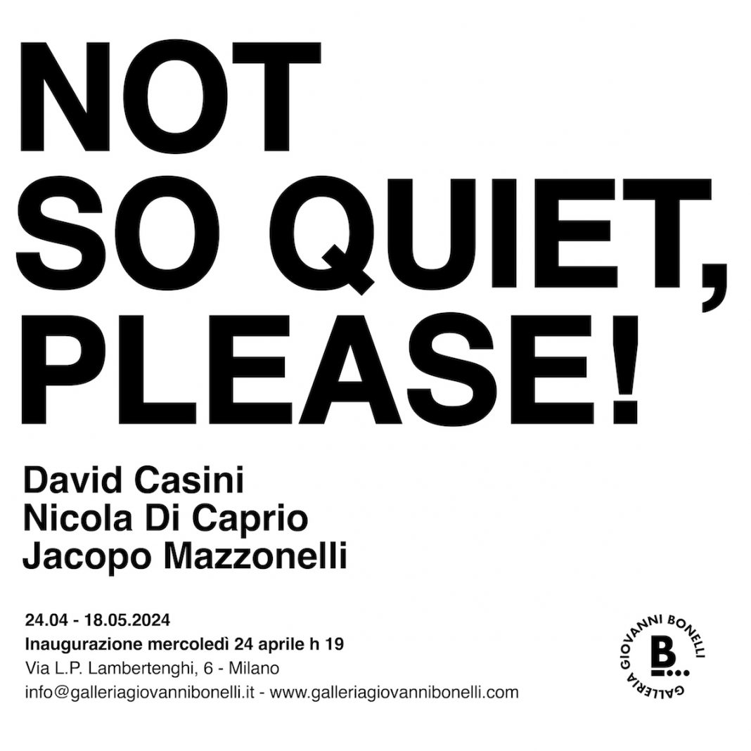La galleria Giovanni Bonelli è lieta di ospitare nei propri spazi la mostra NOT SO QUIET, PLEASE! con opere di David Casini, Nicola Di Caprio e Jacopo Mazzonelli. Gli artisti coinvolti appartengono a tre differenti decenni ma hanno in comune un approccio solo apparentemente “silenzioso” alla musica e una impostazione decostruttivista rispetto alle sue differenti componenti.